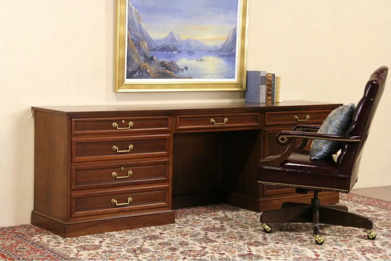 The satiny finish is in excellent condition with small mars at the edges, see photos. American made top of the line vintage furniture, drawers have solid oak dovetailed sides. Large file drawers glide smoothly on ball bearings, hardware is original.