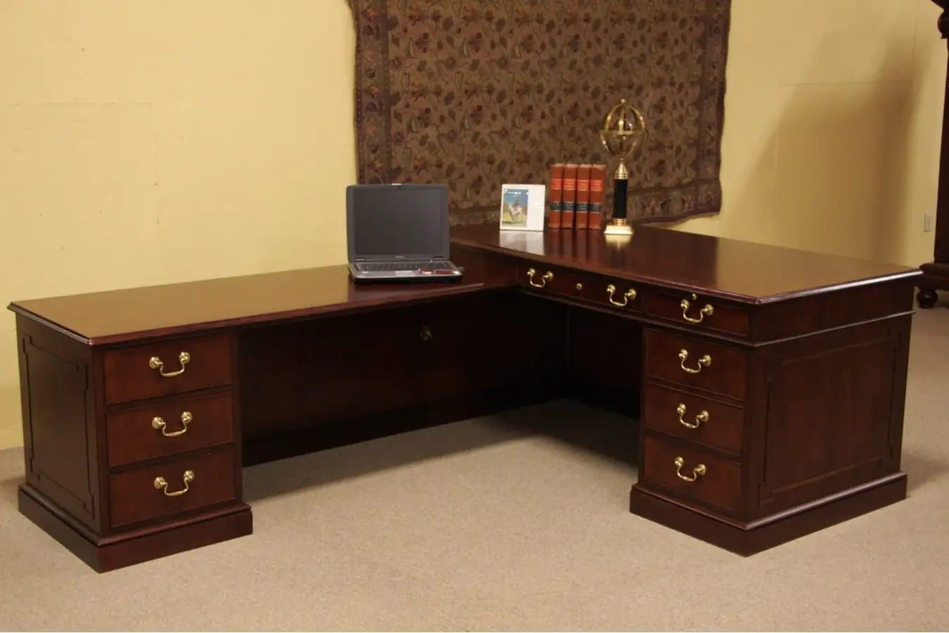 The spectacular quality of signed "Baker" executive furniture is evident everywhere on this mahogany L shaped or corner desk with a right hand return. Top quality vintage furniture from about 25 years ago, both sections are in wonderful condition. Drawers have solid oak dovetailed sides, heavyweight brasses are all original, and there are engraved brass "Baker" and "Collector Edition" plates in the drawer.