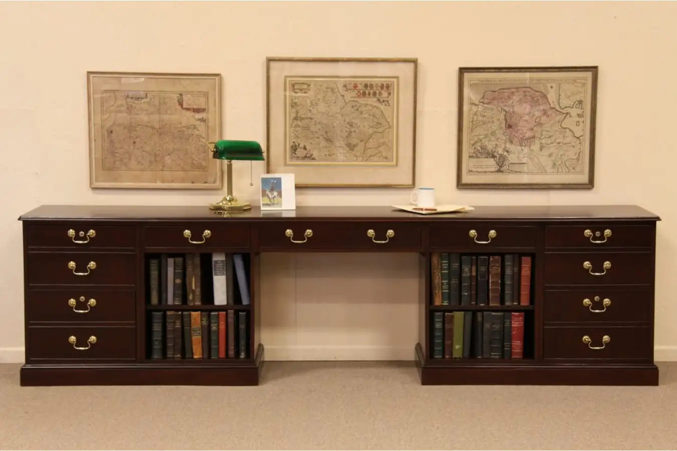 From "Baker," one of America's premier furniture makers, this executive credenza with lateral file drawers and bookshelves would also work well as a computer desk.