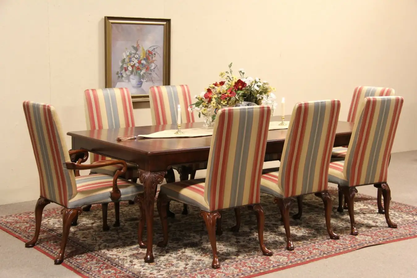 Signed by famous maker, "Baker," this dining set includes a table with leaf and eight chairs, carved in the European Country manner about 30 years ago.