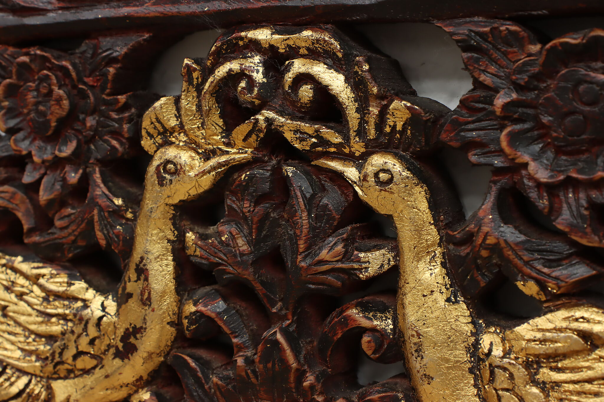 Possibly salvaged from a traditional Balinese temple, this panel or plaque has beautifully carved peacocks with a lovely hand painted and gilt finish.