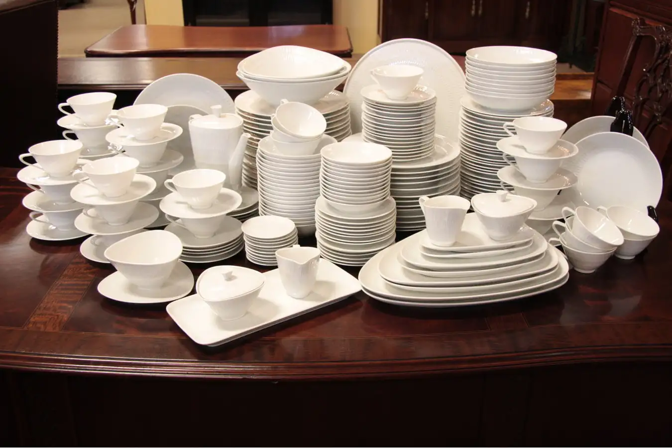 This banquet set of German "Hutschenreuther" Bavarian china would be wonderful for large scale entertaining. The timeless contemporary design is the "Apart" pattern. There is only minimal wear to this sheer and translucent fine china, and damage as noted.