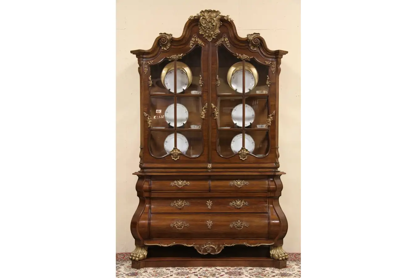 Spectacular Baroque design furniture from about 1910, this dramatic "bombe" china or curio display cabinet is walnut with bronze mounts. The palatial hand carved crest plus eagle claw and ball feet are beautiful.