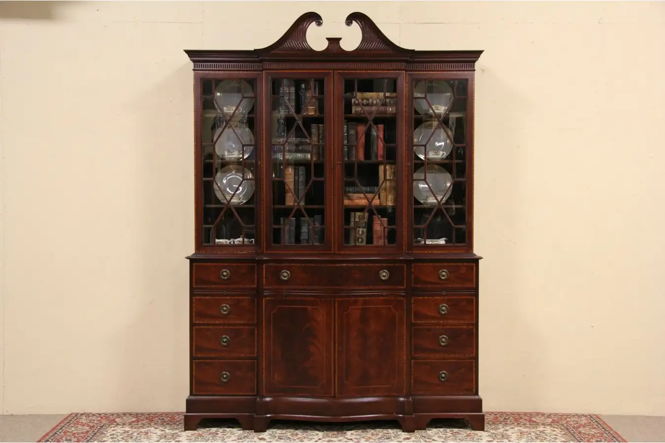 Deep and lustrous, the finish is in very fine condition with warm patina, enhancing the sophisticated banding and matched flame grain panels. The carved pediment and curved lower doors are graceful on this elegant American made vintage furniture. Grillwork on upper doors is authentic with slightly convex individual panes. Dovetailed drawers have solid mahogany sides and hardware is original.