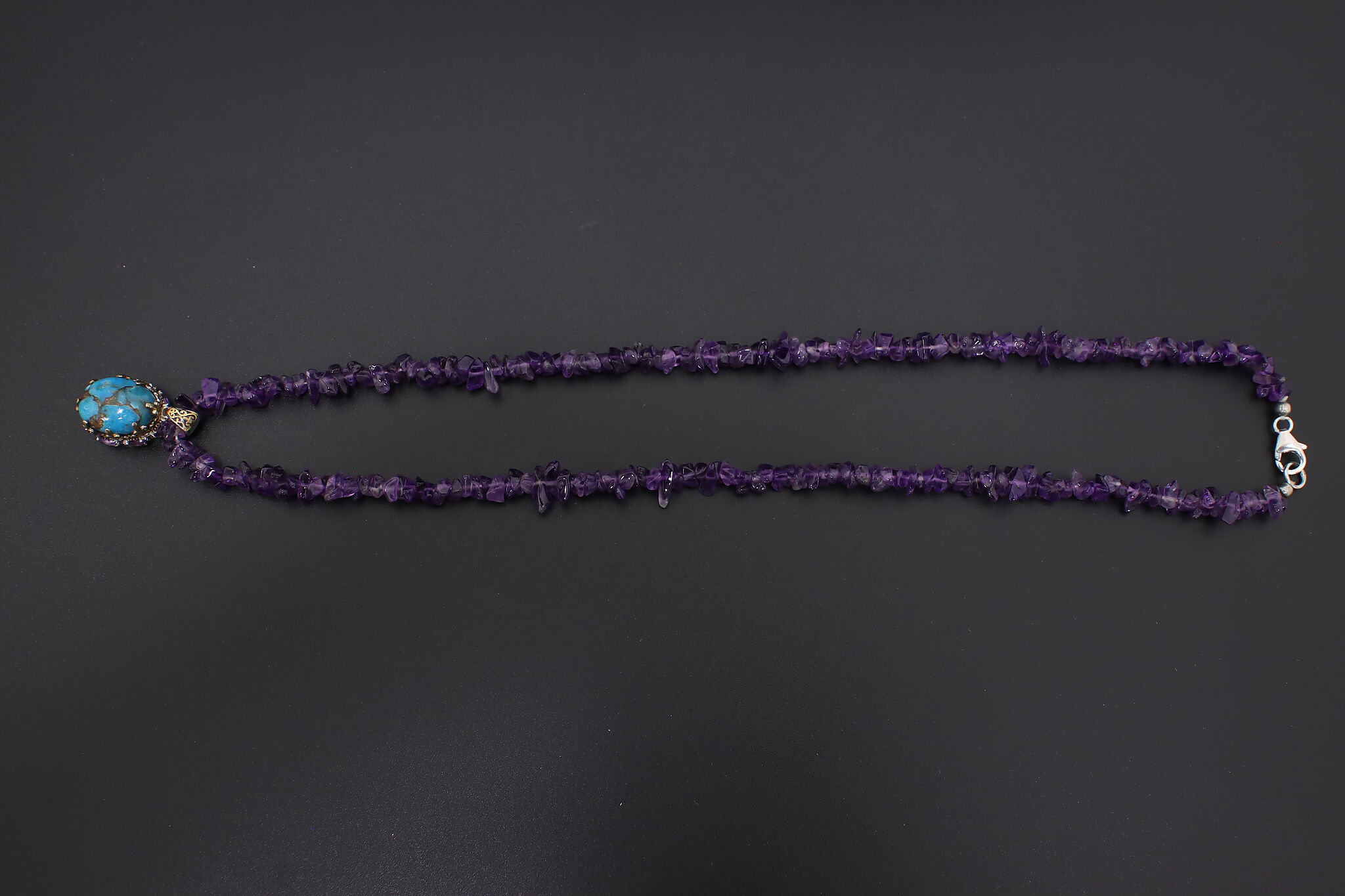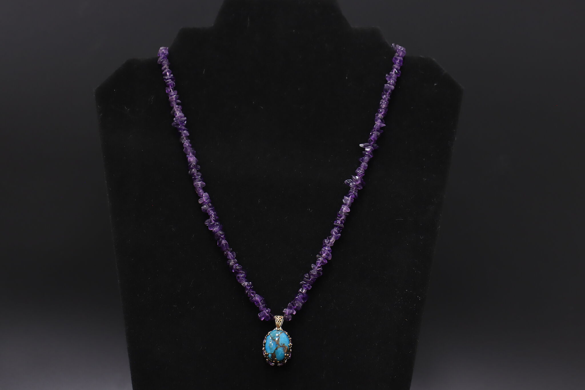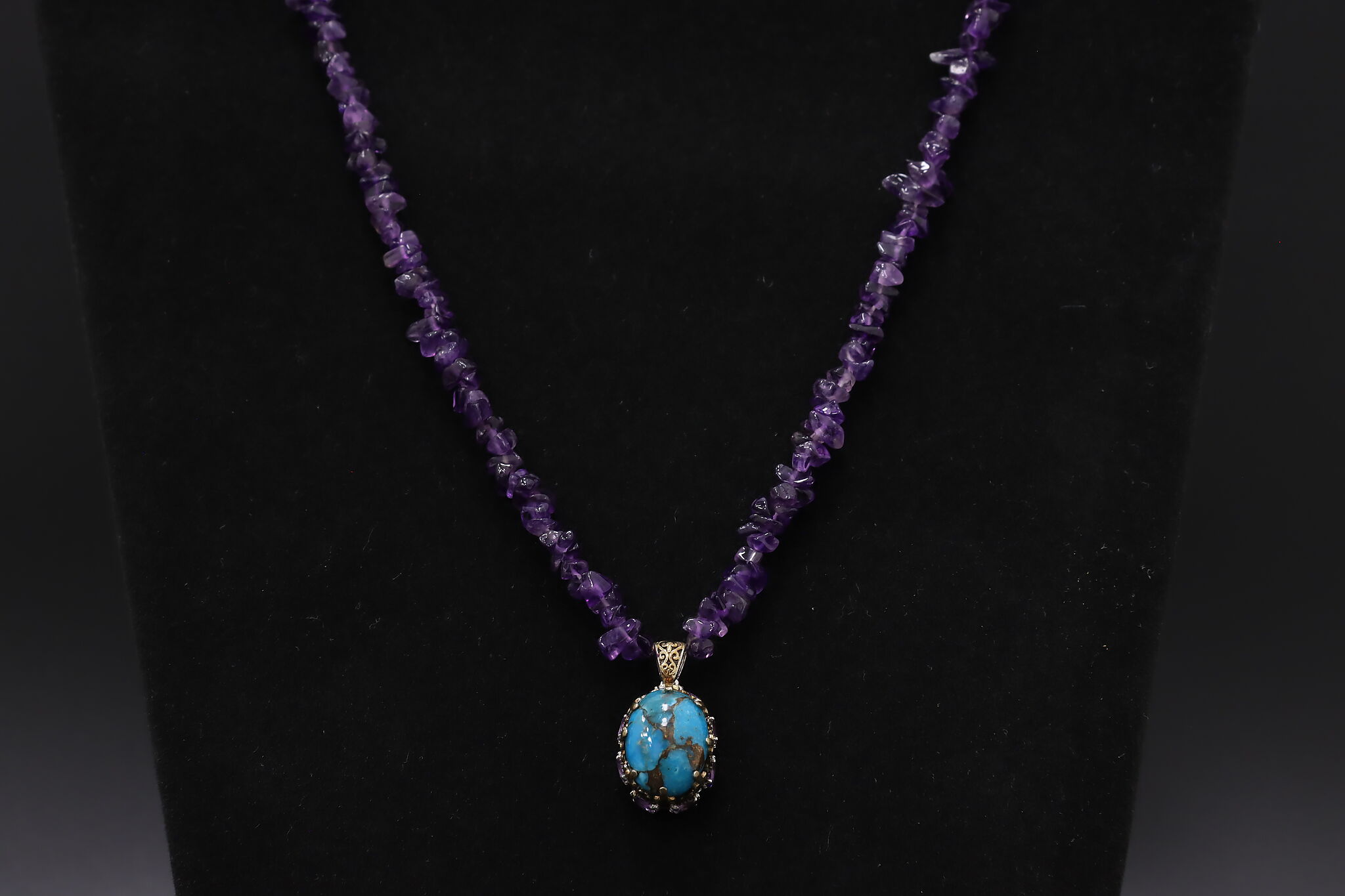 The beautiful raw amethyst gemstones are complimented with a turquoise pendant for a striking necklace.
