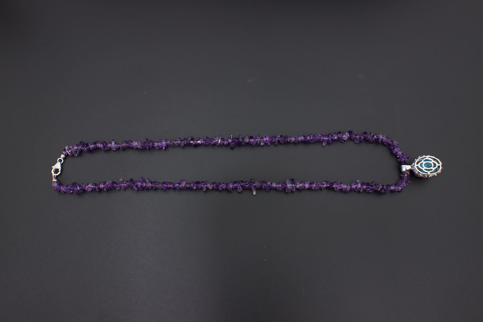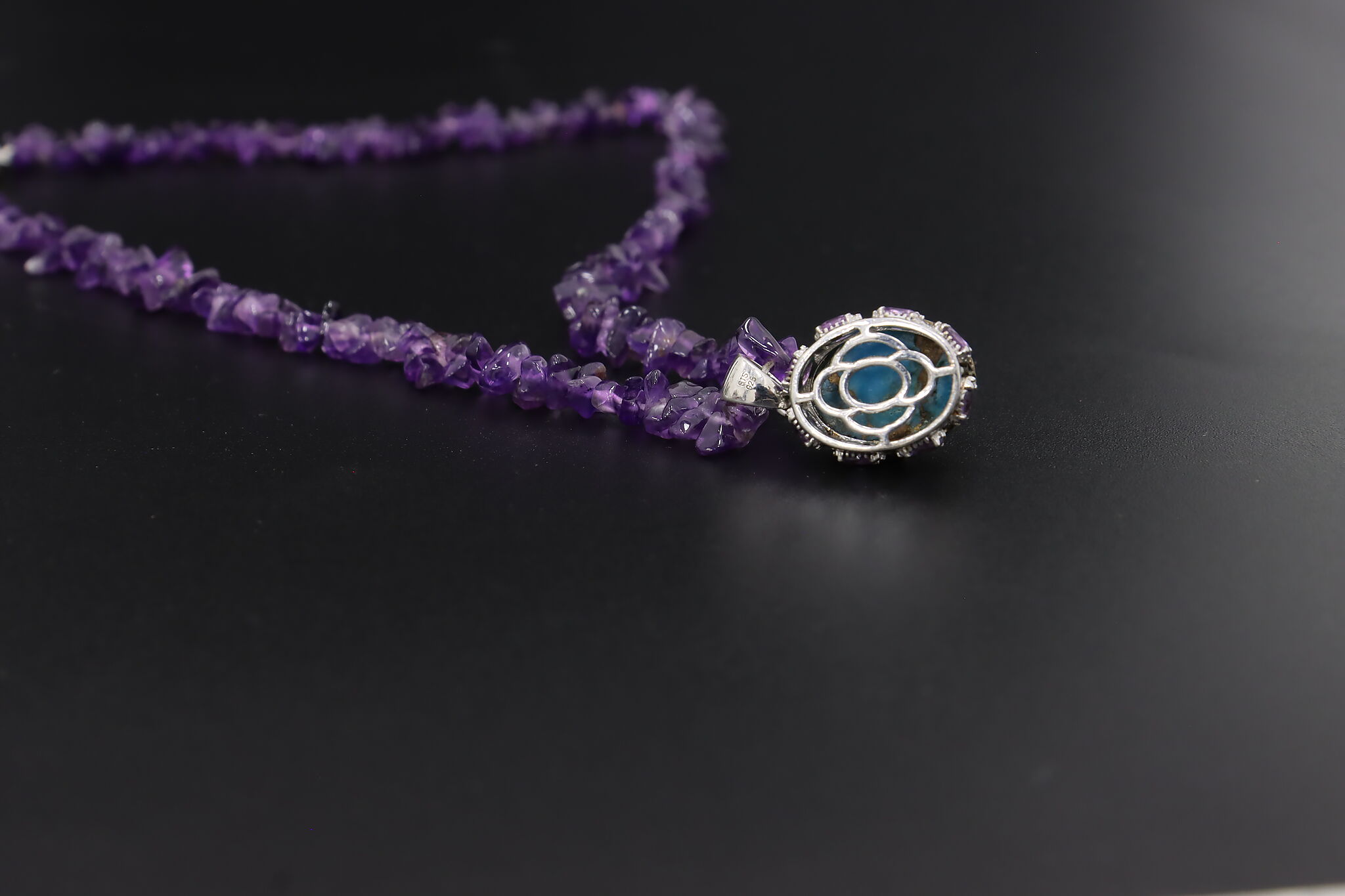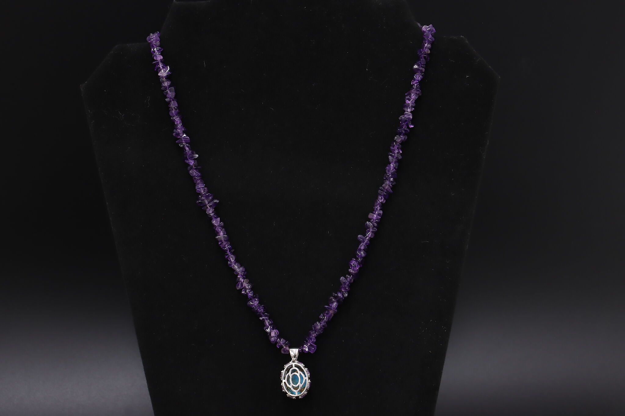 The beautiful raw amethyst gemstones are complimented with a turquoise pendant for a striking necklace.