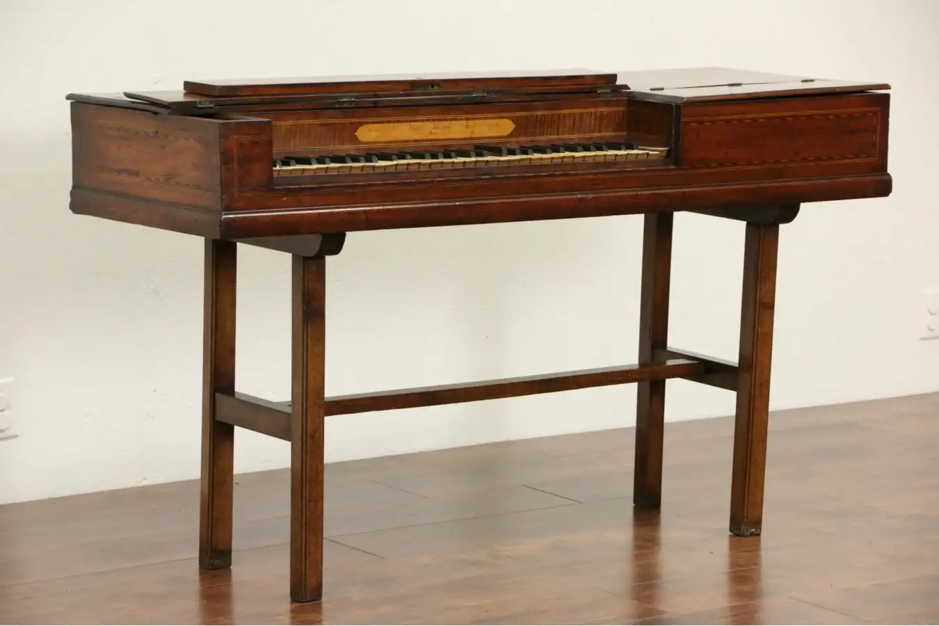 The sound board is warped and cracked, and to play, this musical instrument would need major restoration. The case is mahogany with inlaid satinwood banding, the base is oak and may be later. There are losses and mars, plus warm antique patina to the old worn finish.