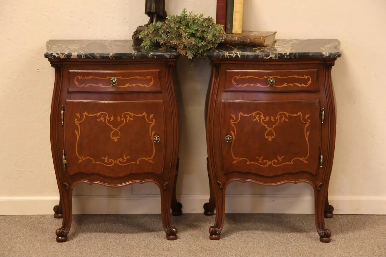A true right and left pair of spectacular "Bombe" shaped bedside or end tables or nightstands has inlaid marquetry design. The satiny finish on matched walnut burl is very fine with beautiful antique patina and character - the usual small shrinkage separations and minor mars.
