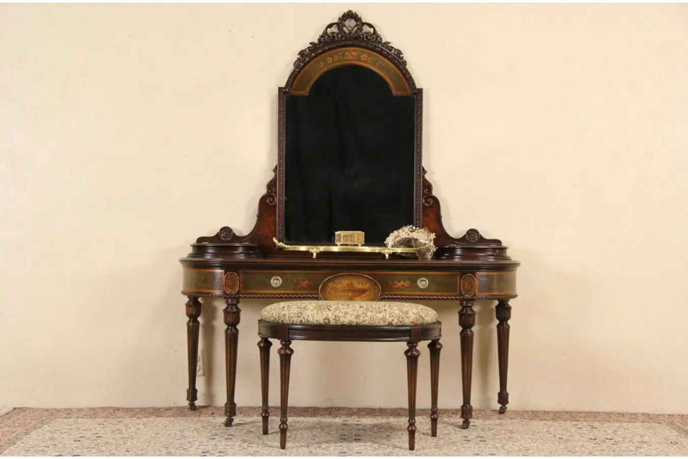 Signed by famous maker, "Berkey & Gay," this dressing table or vanity and bench have delicate original hand painting. Walnut with matched burl, the finish is in excellent condition with minor mars at the the edges, see photos. There are various restorations and touchups.