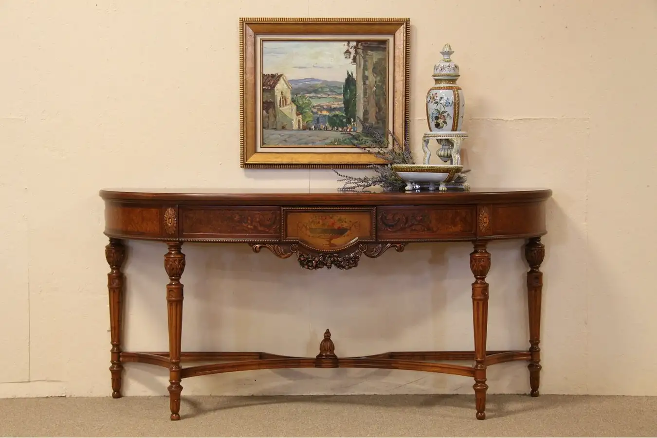 Demilune or half-round shaped, this beautiful console table is signed by famous maker, "Berkey and Gay." Useful in a hall, dining room or foyer, the top has a sunburst pattern in walnut burl, accented with curly elm burl and ebony banding. Classical hand-painted motifs are original.