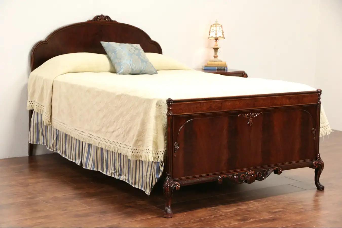 A superior quality bed can be either queen or full size, and is signed by famous maker, "Berkey and Gay" in the 1920's. Matched flame grain mahogany has an excellent gleaming finish.