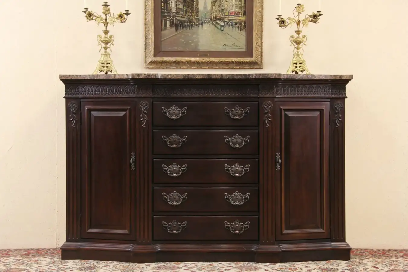 All original, the deep finish on cherry wood is in excellent condition, lightly distressed to look like an antique. The "Brescia" marble top is from the famous ancient quarry near the Italian city at the foot of the Alps. Embossed hardware is original.