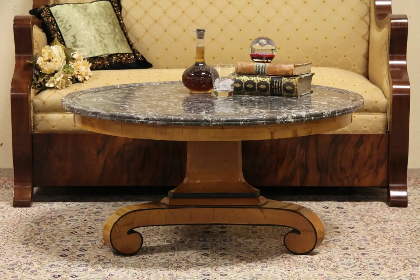 The sculpted marble top is excellent, and the classic base in birch with ebony is strong and solid. Wooden pegs attach the top, it is not obvious where the reduced height took place, so we assume it was done by a very skilled carpenter within the last 75 years.