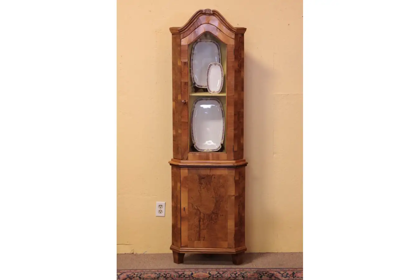 This genuine Biedermeier or Empire Period corner cabinet was hand made of glowing fruitwood and burl about 1825. The gleaming finish is excellent with gorgeous and intricate natural graining. Note small shrinkage separations as would be expected in an antique of this age.