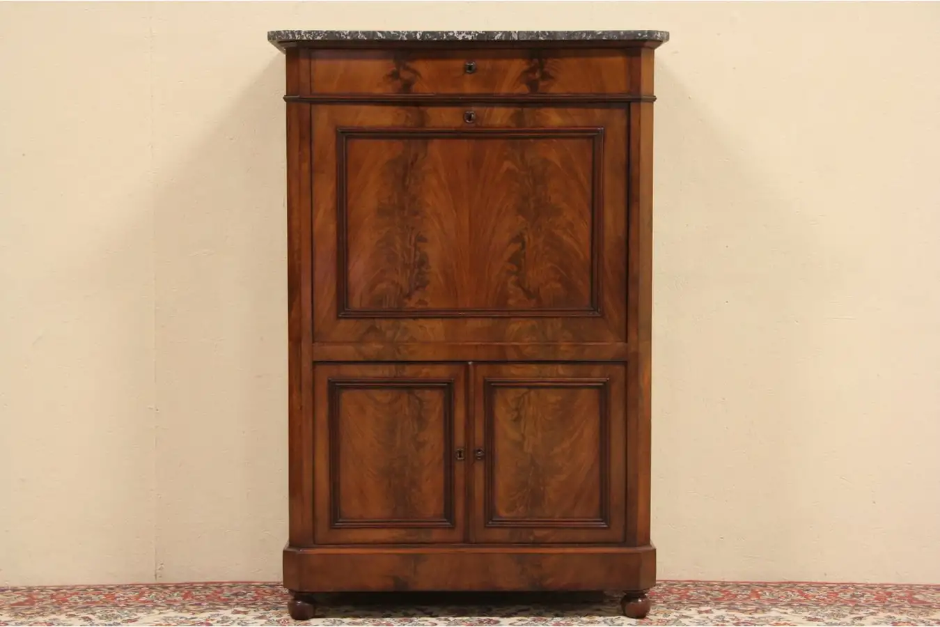 Entirely hand crafted in the Biedermeier or Empire manner about 1860 in Scandinavia, this opulent but understated secretary desk has a marble top.