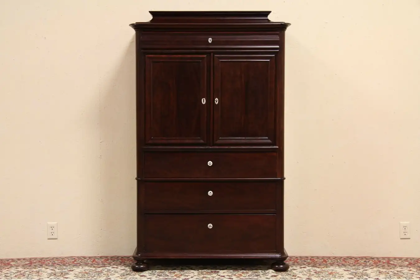 Large lower drawers are also hand dovetailed with book matched flame grain mahogany fronts and beautiful mother of pearl escutcheons. The lock on the cabinet works, the remaining keys ask as handles to pull the drawer open. This historic furniture rests on bun feet.