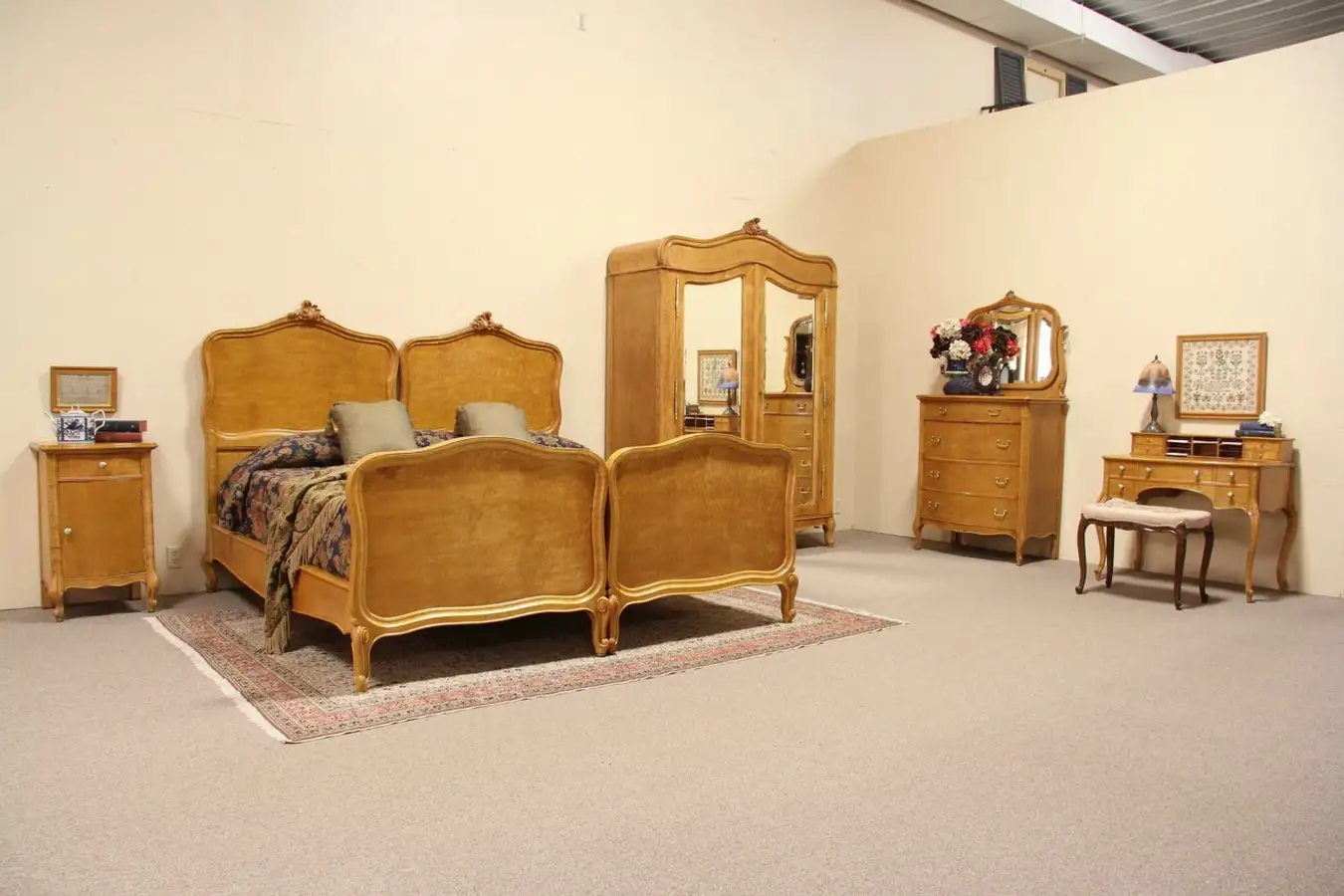 A genuine "birdseye" or curly grain original bedroom furniture set from about 1910 has a King Size Bed or Pair of Twin Beds, Highboy, Vanity, Armoire, and Nightstand. The finish is in excellent condition on this American crafted furniture.