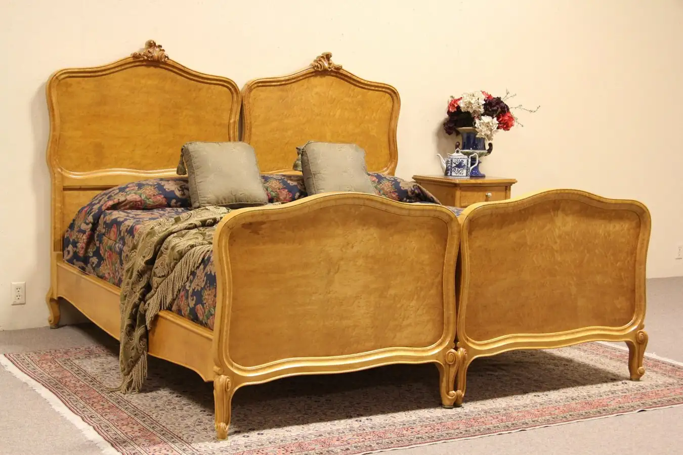Genuine "birdseye" or curly grain maple furniture from about 1910, a pair of twin or single size beds were adapted to fit a standard modern king size mattress as shown in photos.