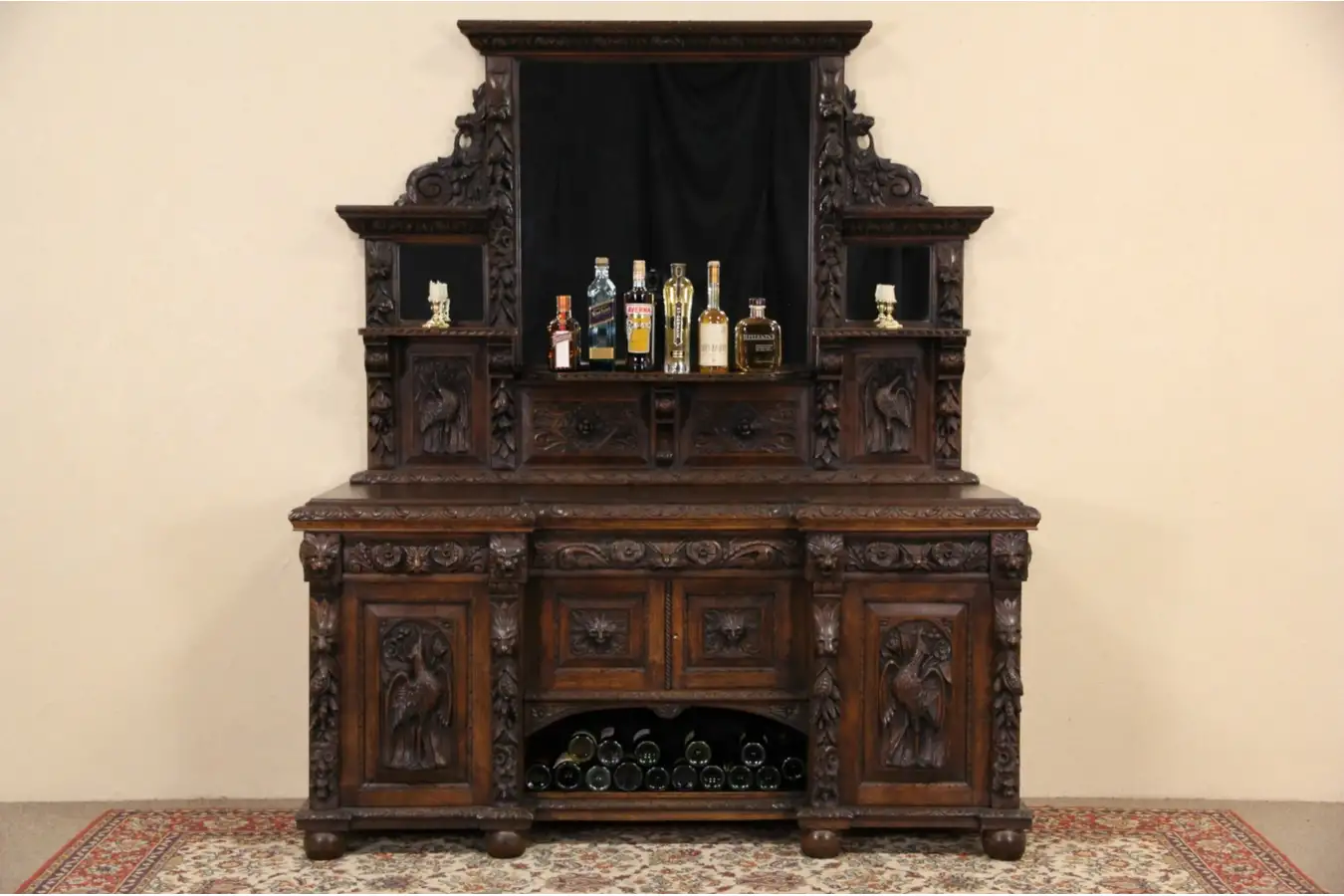 A monumental "Black Forest" back bar, sideboard or server was hand carved of solid oak in the 1870's. Three dimensional sculptures of lions, fruit and crane birds are artistic. This style of furniture is from the famous area where Germany, France and Switzerland meet, this outstanding example is French.