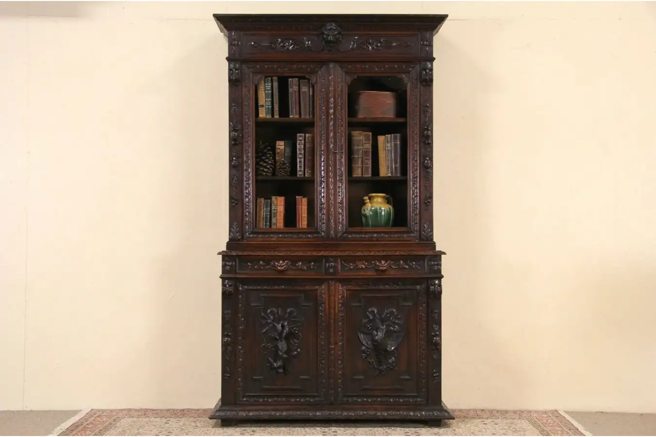 From the fabled "Black Forest" region where France, Switzerland and Germany meet, this hand carved solid oak bookcase or china cabinet dates from around 1880.