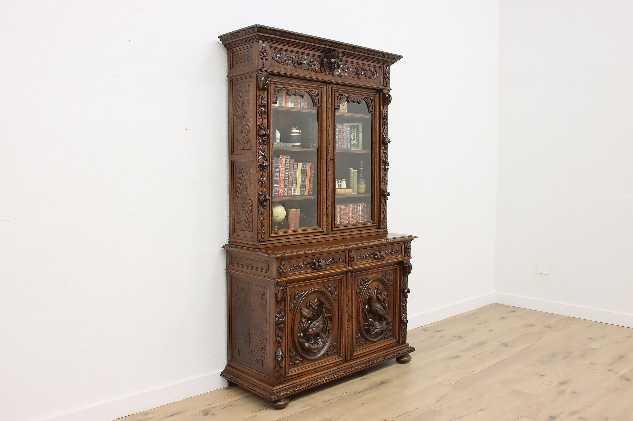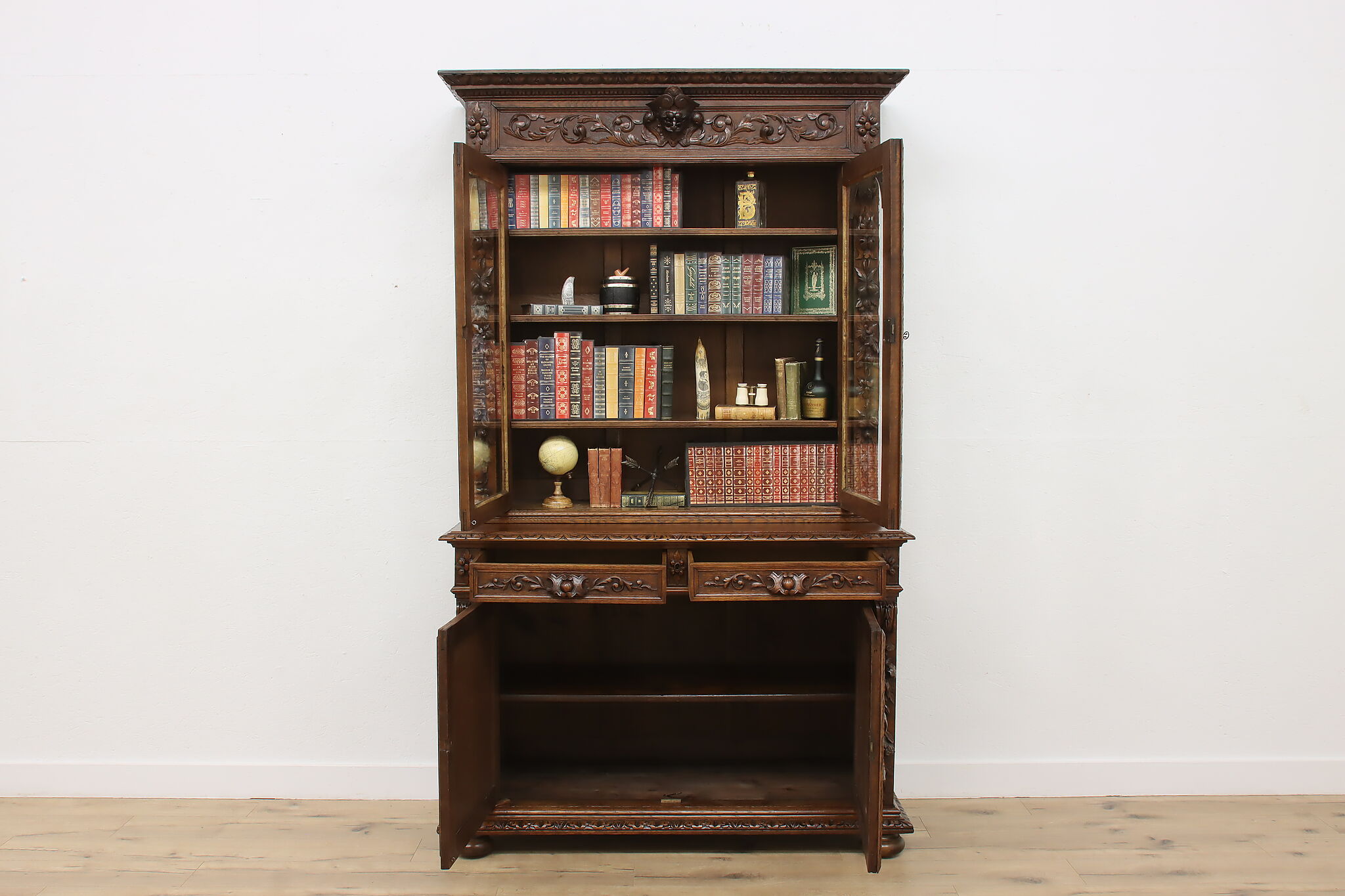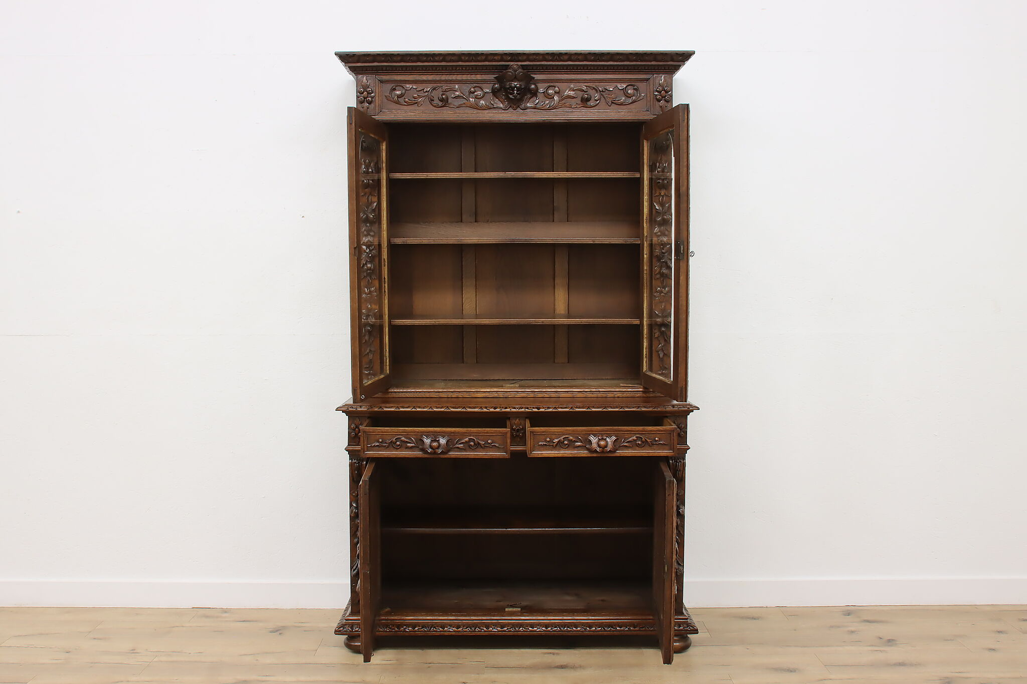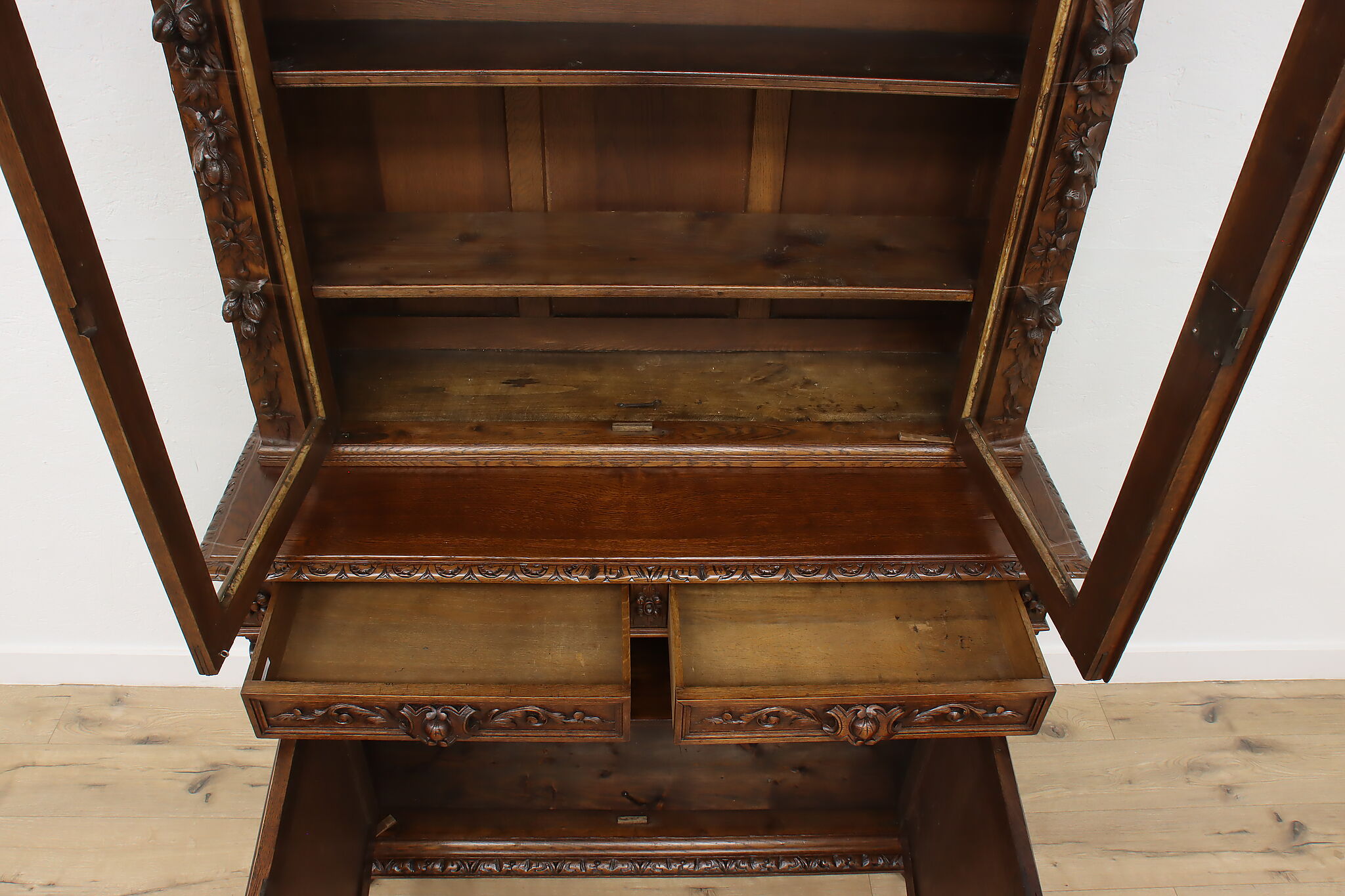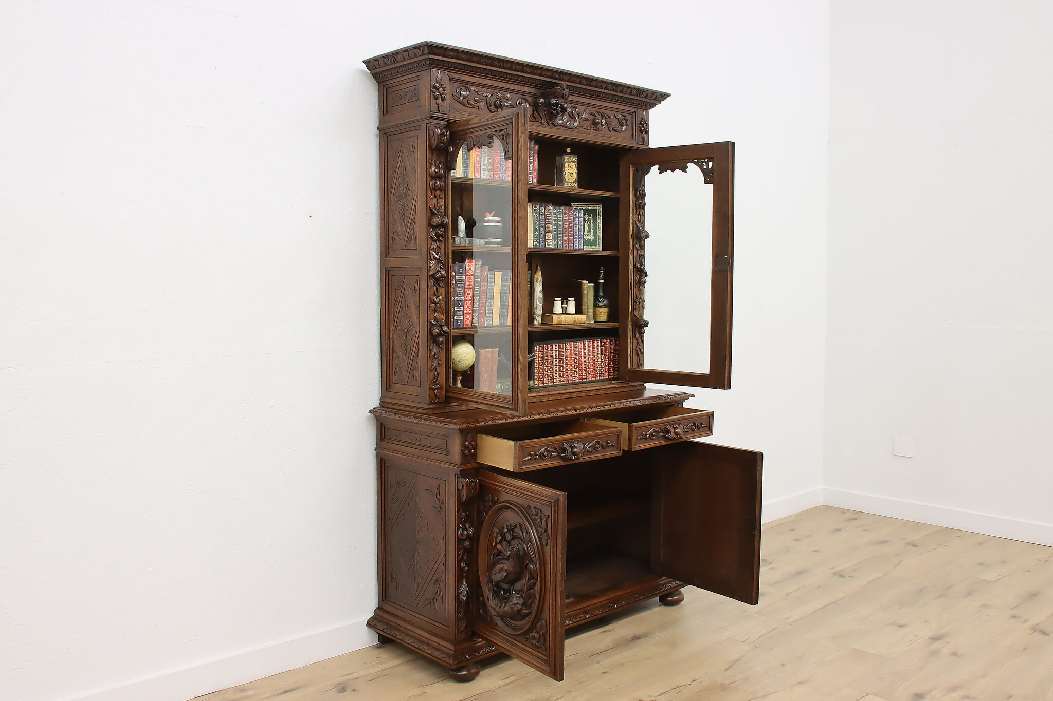 Gorgeously carved in the mystical Black Forest, this cabinet is the perfect piece to use as a bar, china display, or bookcase!