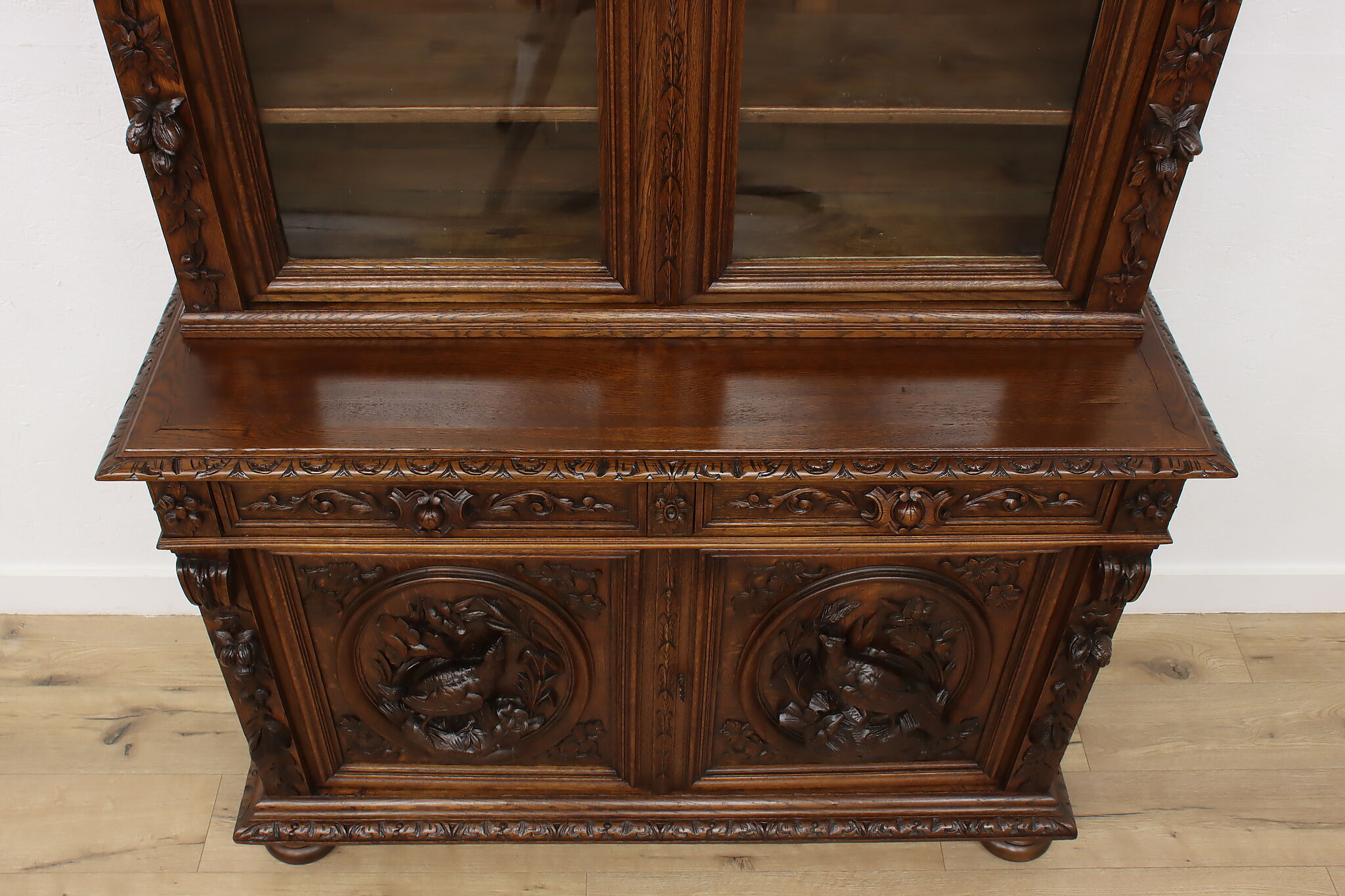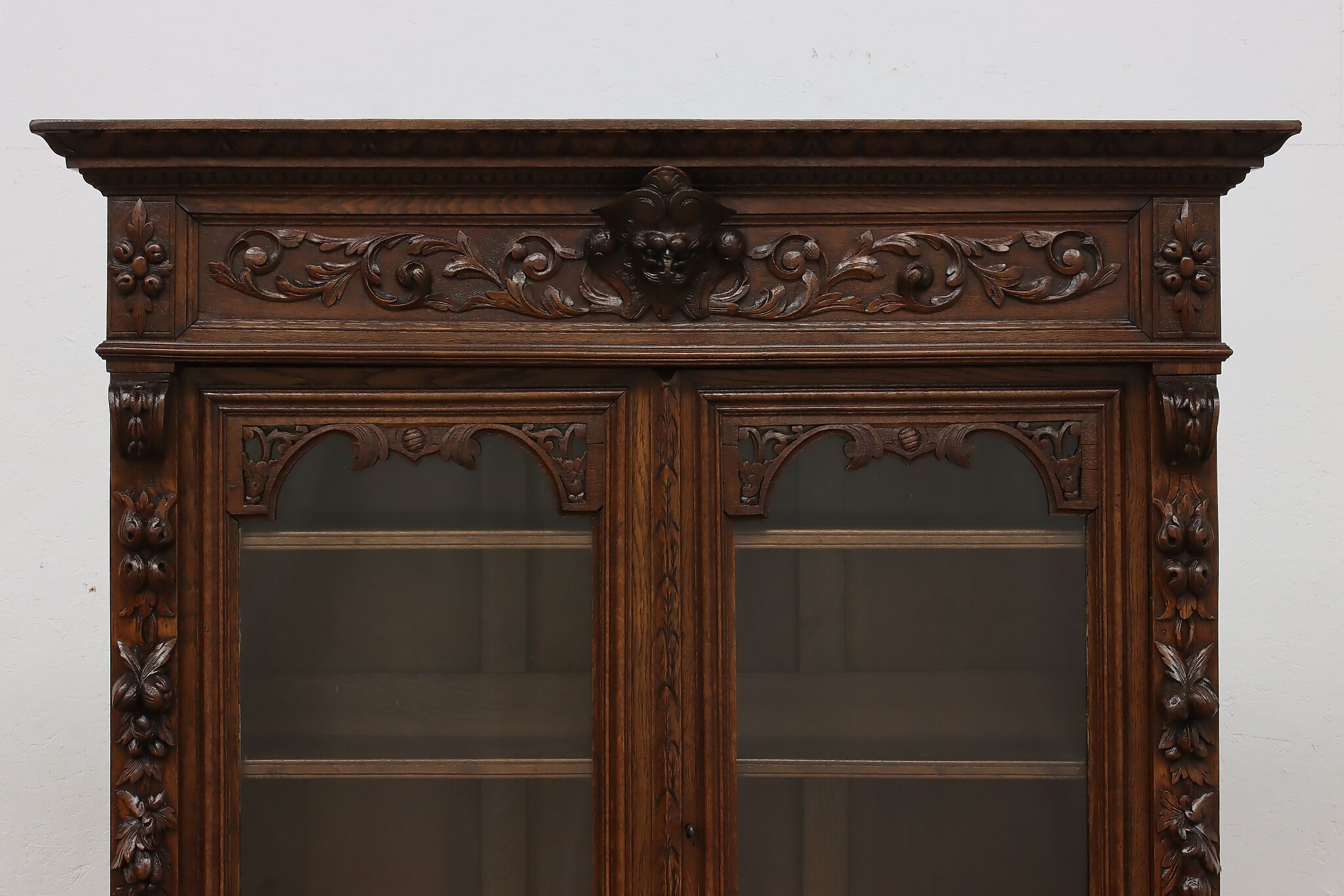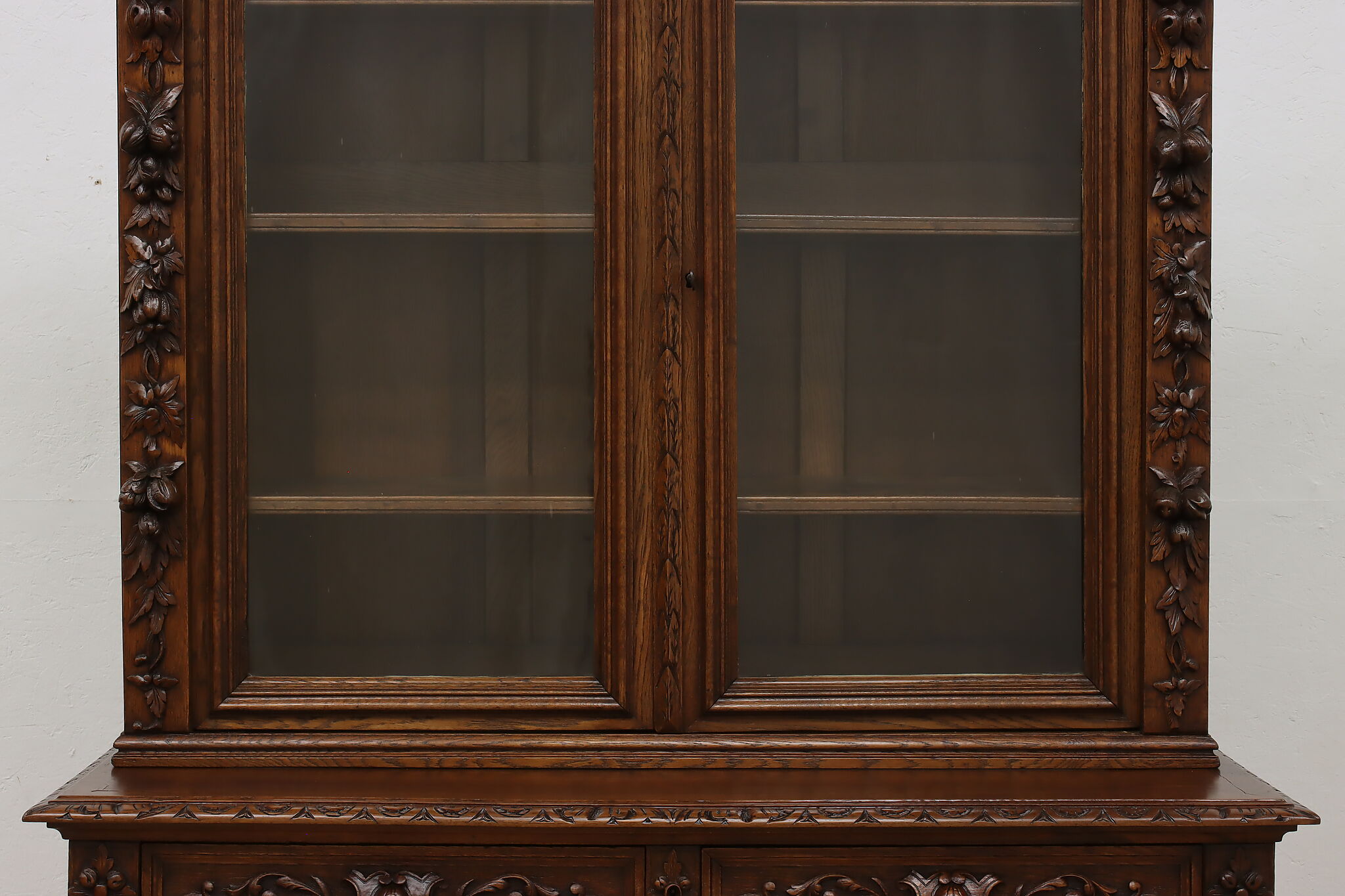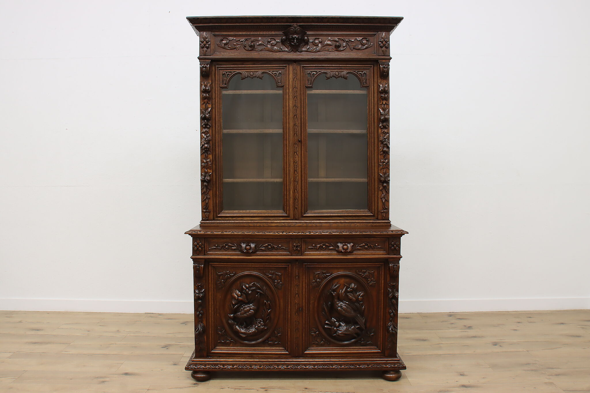 Gorgeously carved in the mystical Black Forest, this cabinet is the perfect piece to use as a bar, china display, or bookcase!