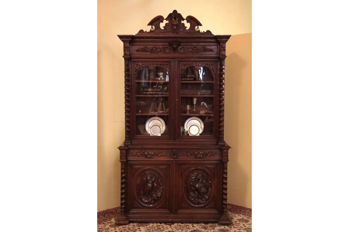 Magnificently hand-carved in solid oak with game and birds, one holding a fish, a Victorian Black Forest hunt cabinet or bookcase shows masterful craftsmanship.
