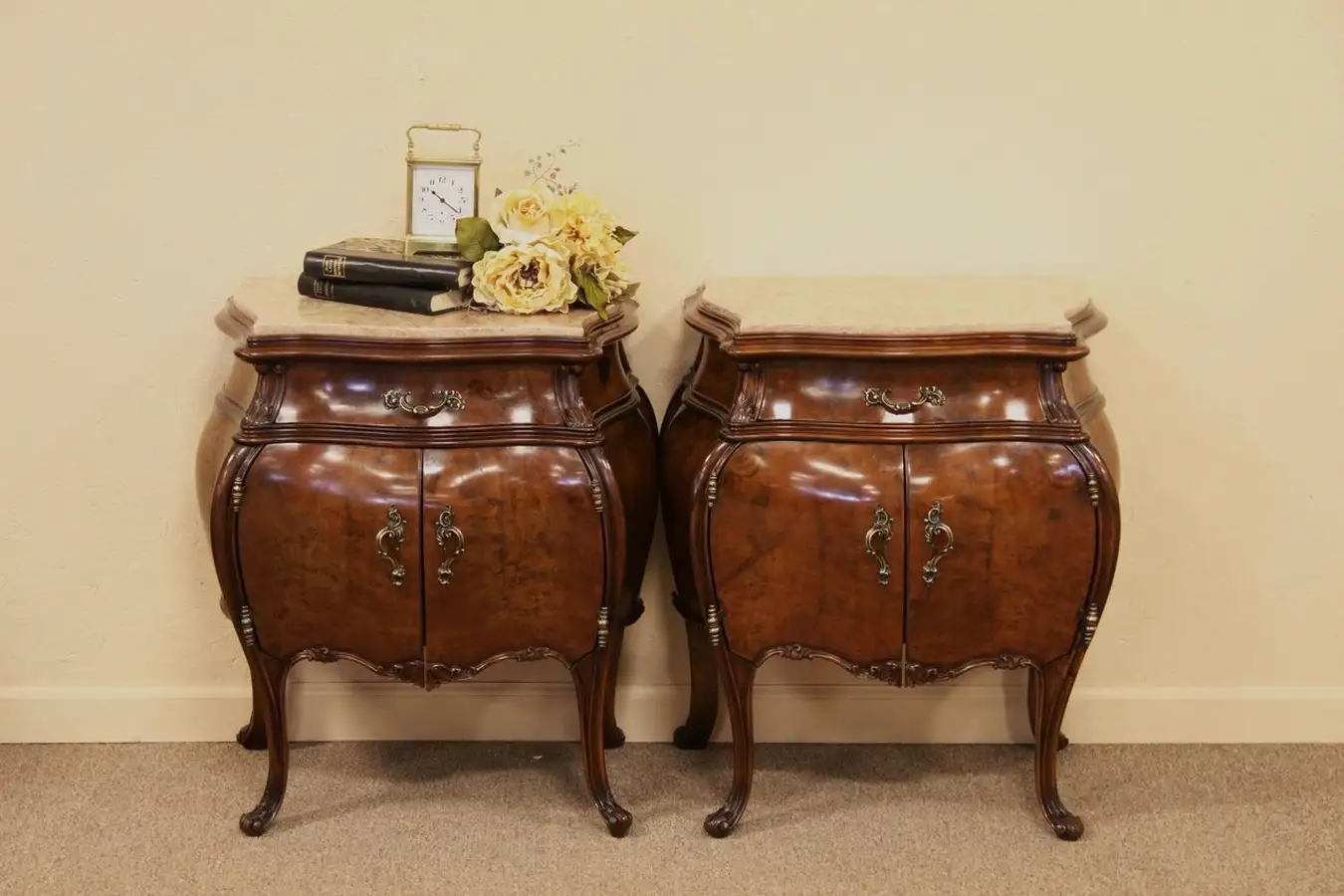 This elegant pair of nightstands or bedside tables has flowing and graceful lines. They are richly hand- carved at the edges with "bombe" or convex panels of walnut burl and marble tops.