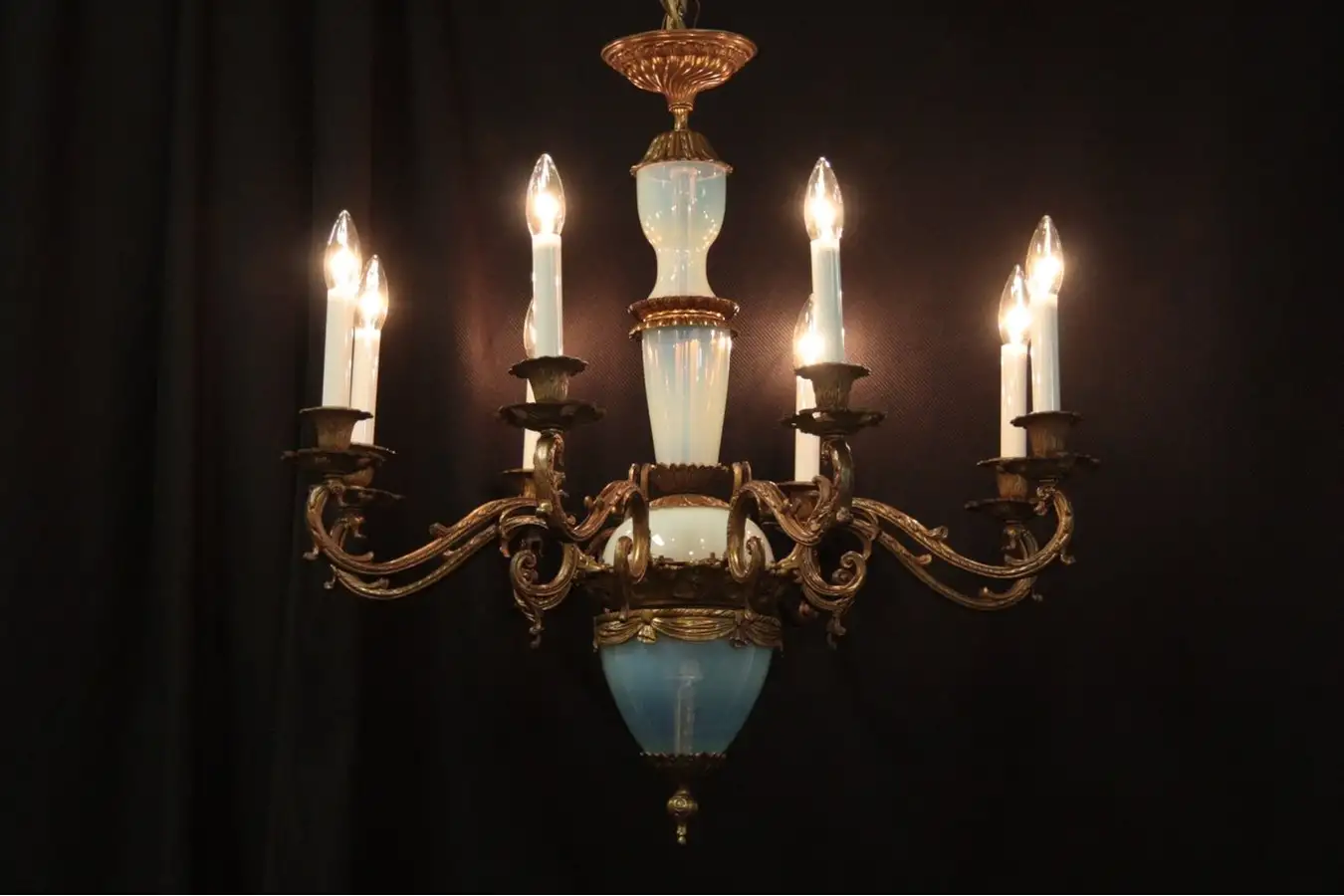 A cast embossed brass frame enhances the mouth-blown "opalescent" glass mounts on this lovely chandelier. Subtle shadings and pink "fire" in the opal glass are beautiful.