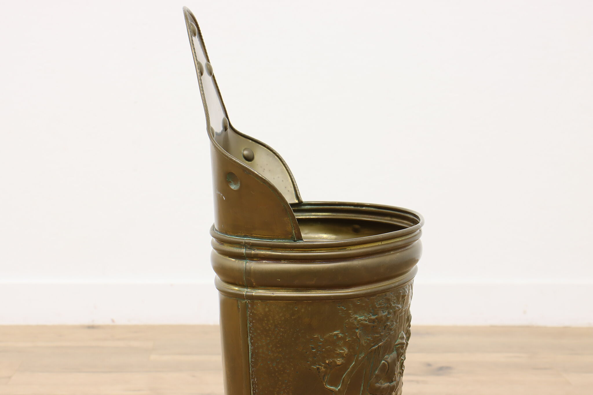 An umbrella and cane hall stand has an embossed scene of a tavern and is signed "Le Lobelia Marq. Dept."