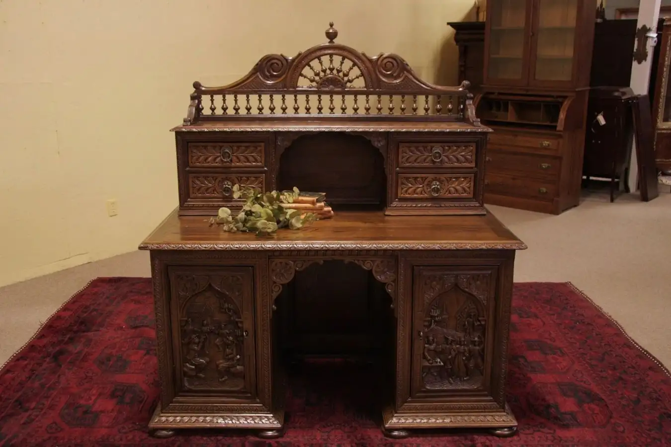 The medium brown original finish is excellent on this spectacular heirloom furniture, which traditionally descended with the daughters of a family as part of their dowry. Behind the carved doors are shelves and a hand dovetailed drawer, bun feet support the desk. The gallery section is removable.