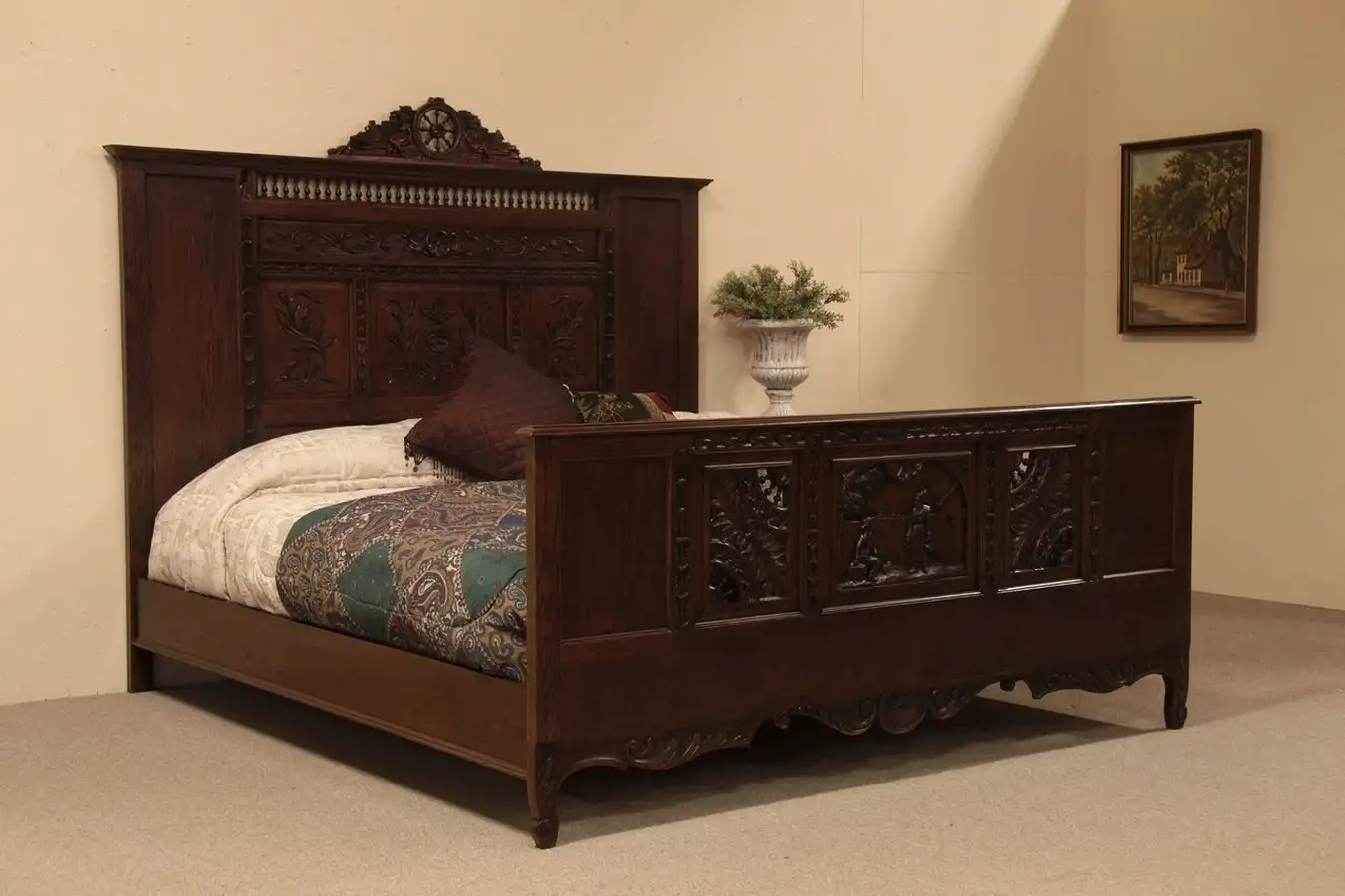 A courting scene, artistically sculpted in high relief in solid oak and chestnut depicts traditional folk garb with wooden shoes on the footboard.