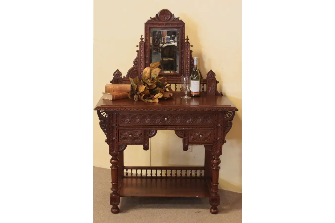 Hand carved of solid chestnut about 1900, this desk, hall table or dressing table would also make a wonderful vessel sink vanity.