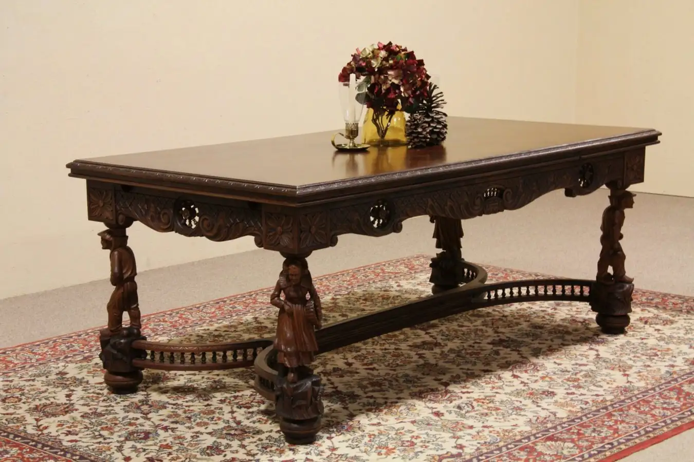 A traditional Brittany dining table is hand carved with four individual figures in traditional dress supporting the top, and dates from about 1915. Solid chestnut and oak, the incredible three dimensional sculptures are fruitwood. The original satiny finish is excellent, the top has been revarnished.