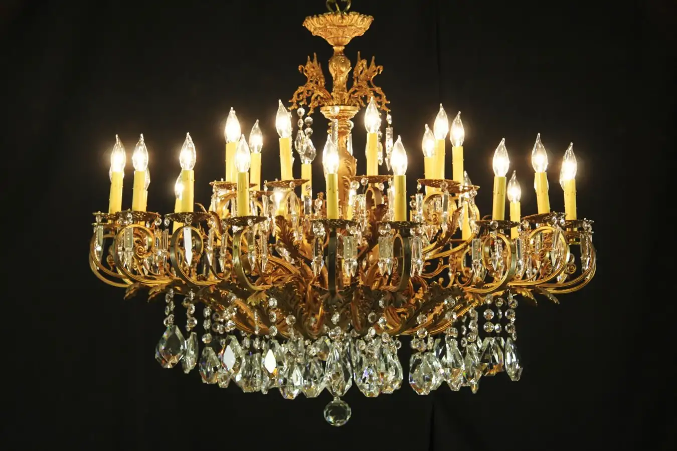 This embossed bronze chandelier from Scandinavia has 30 candles, swans and hundreds of cut crystal prisms, dating from about 40 years ago.