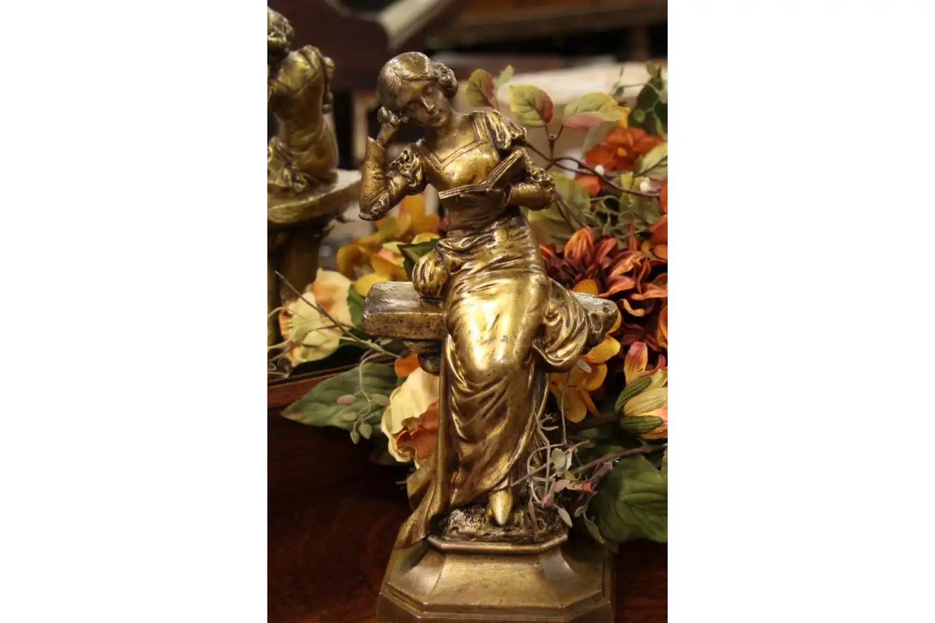 This lovely Art Nouveau bronze statue of a beautiful young woman reading a book is dated 1910. Signed "P. Rigual," this naturalistic work of art represents a thoughtful reader with beautifully draped clothing, lost in her reading and unselfconscious. The glowing "gold dore" patina has slight wear and there may be something missing below her elbow.