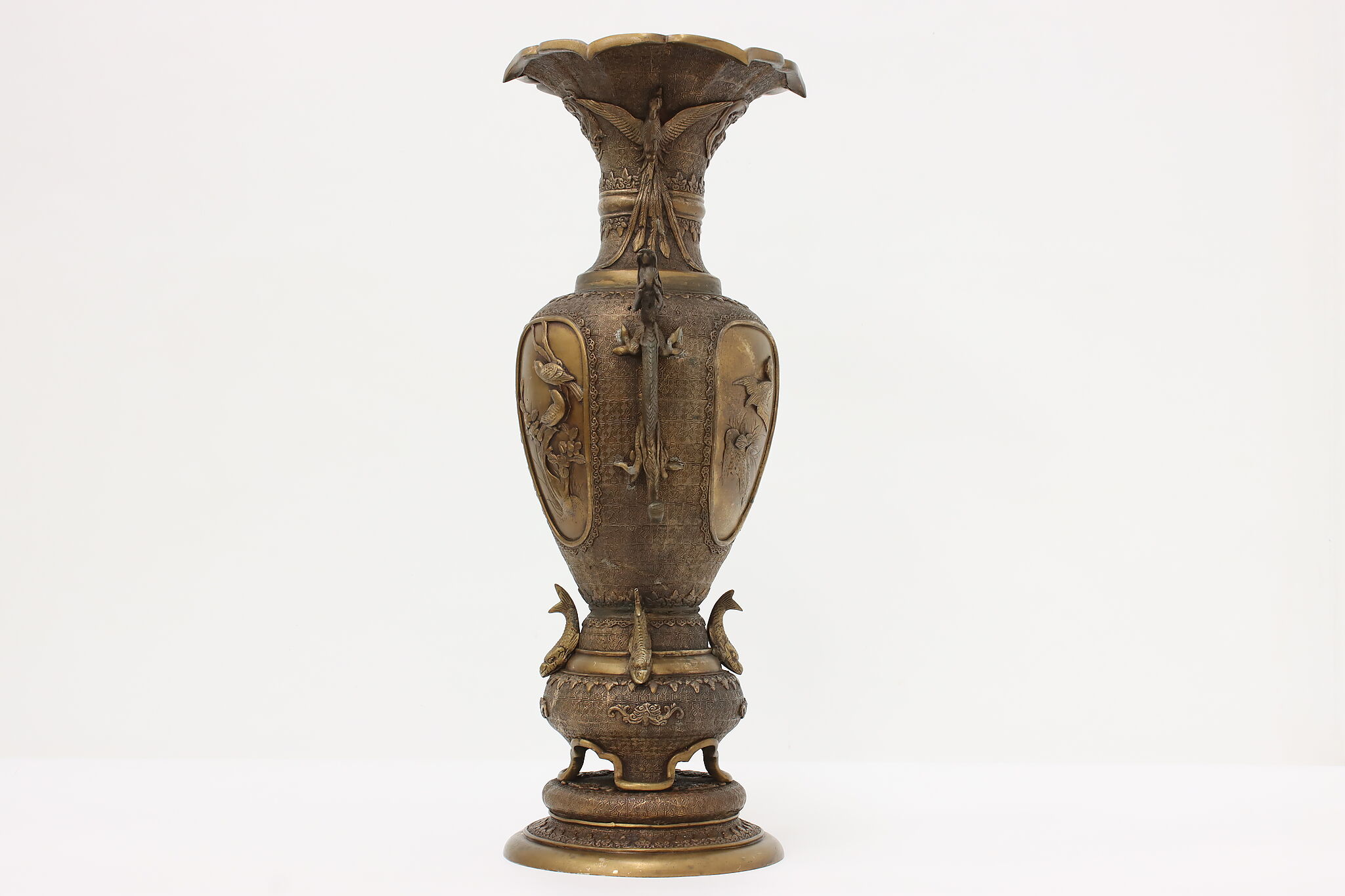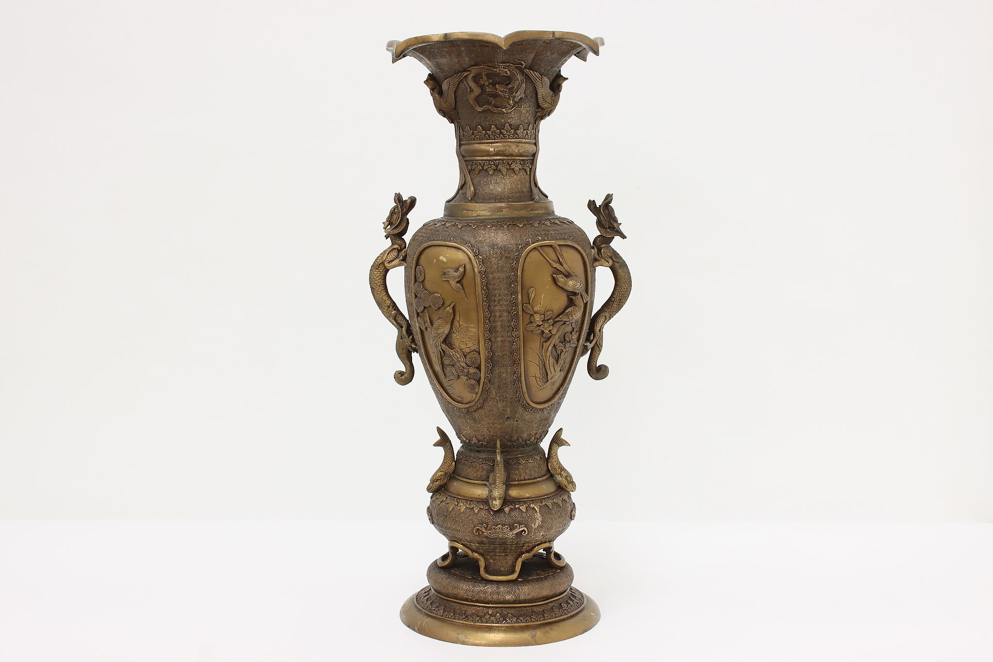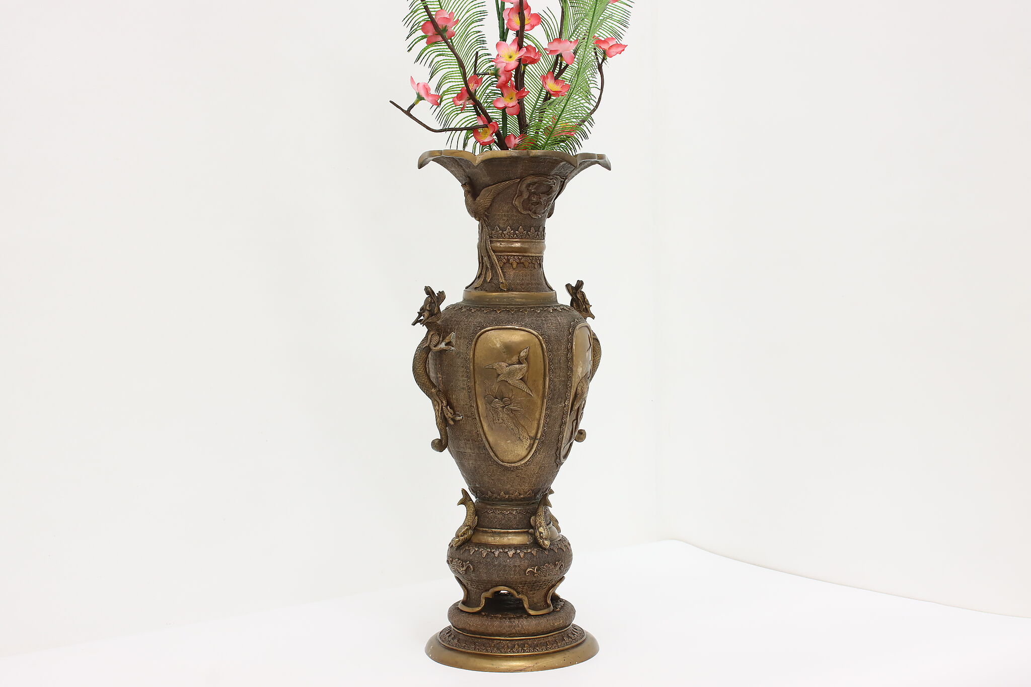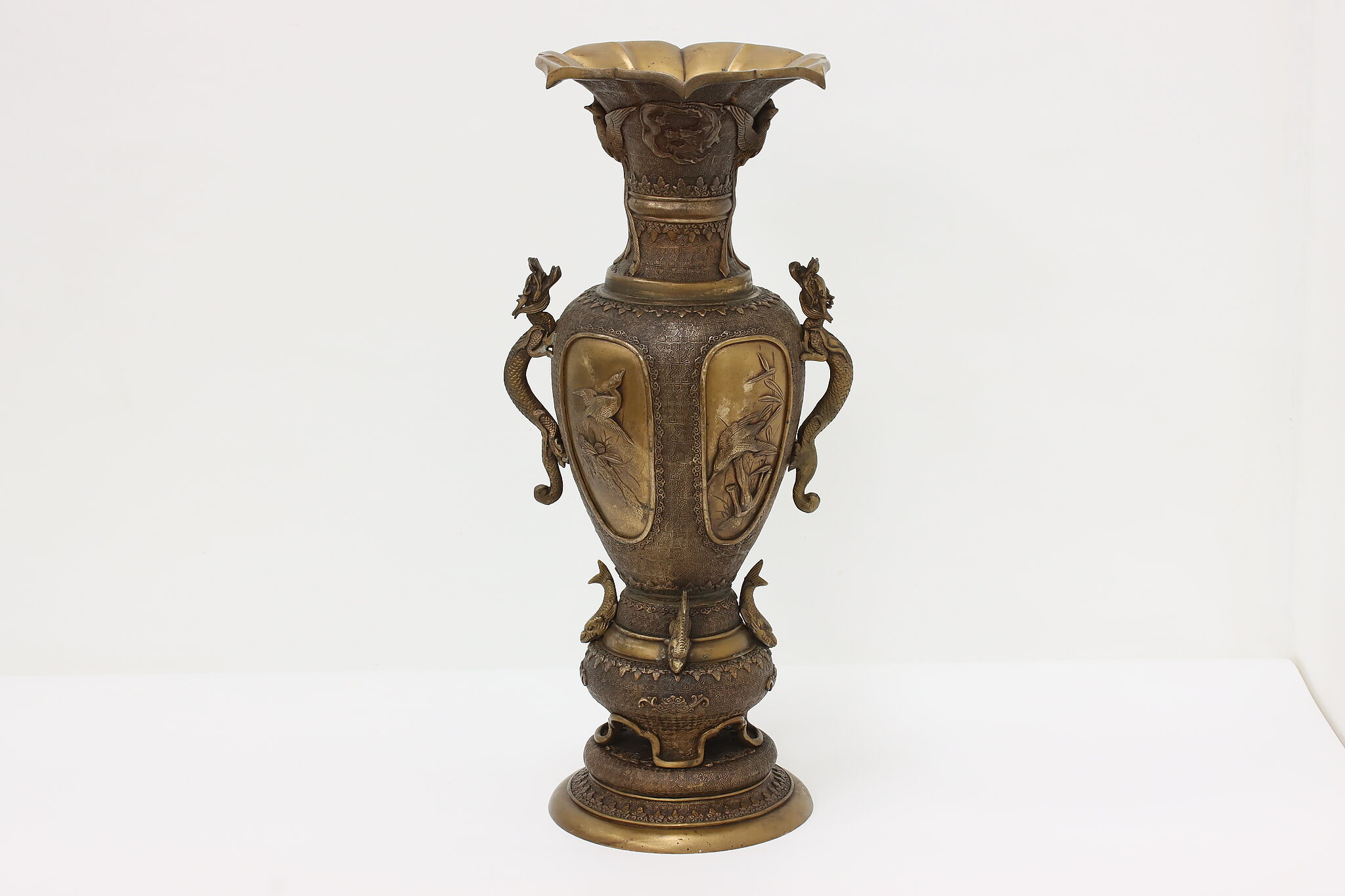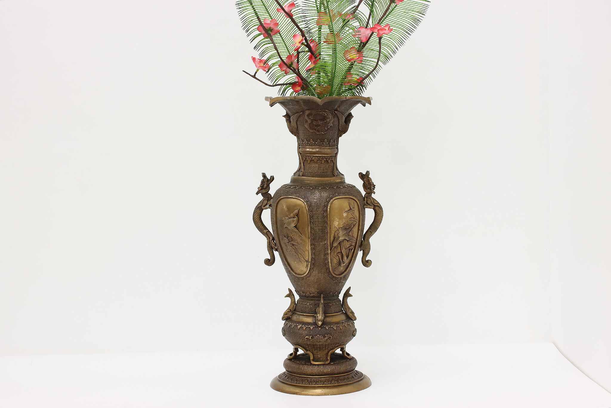 This gorgeous Meiji period flower vase has dragon, phoenix, and koi fish figures. In many Asian cultures, especially Japanese, these creatures hold immense power. Dragons and phoenixes are protectors, while koi fish represent perseverance and luck.