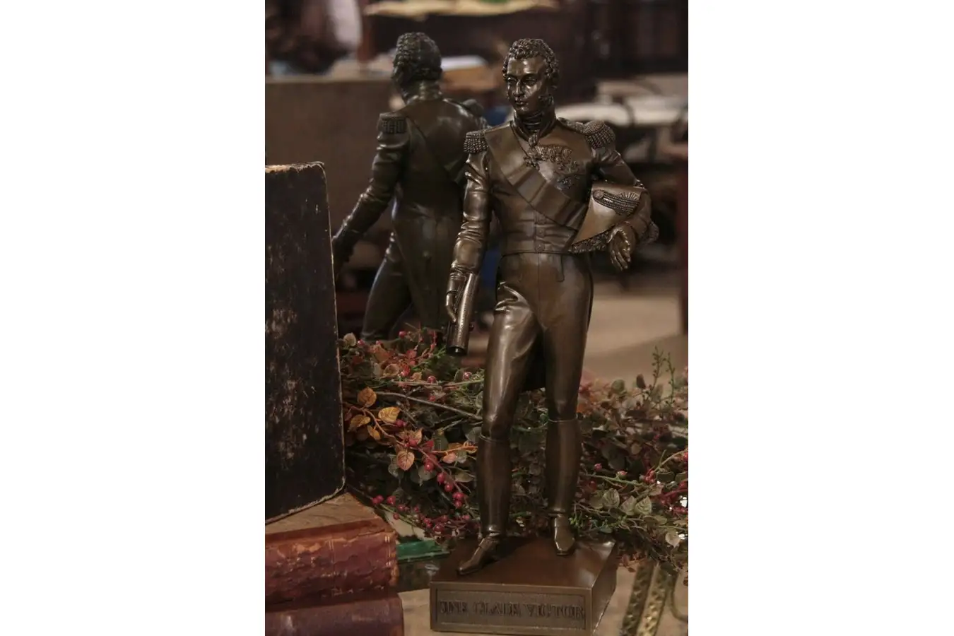 An exceptionally detailed bronze sculpture represents Louis Antoine, then Dauphine of France, or crown prince under his father, Charles X, King of France. The engraved inscription on the base is a Latin motto of gracious mercy, "Victory without Scourge." The Dauphine holds a scroll engraved with the story, "Spaniards believe in the word of a Bourbon." This refers to his assistance to a fellow Bourbon family member, the king of Spain, whom he helped quell an insurrection in Alcobendas, near Madrid, in 1823.