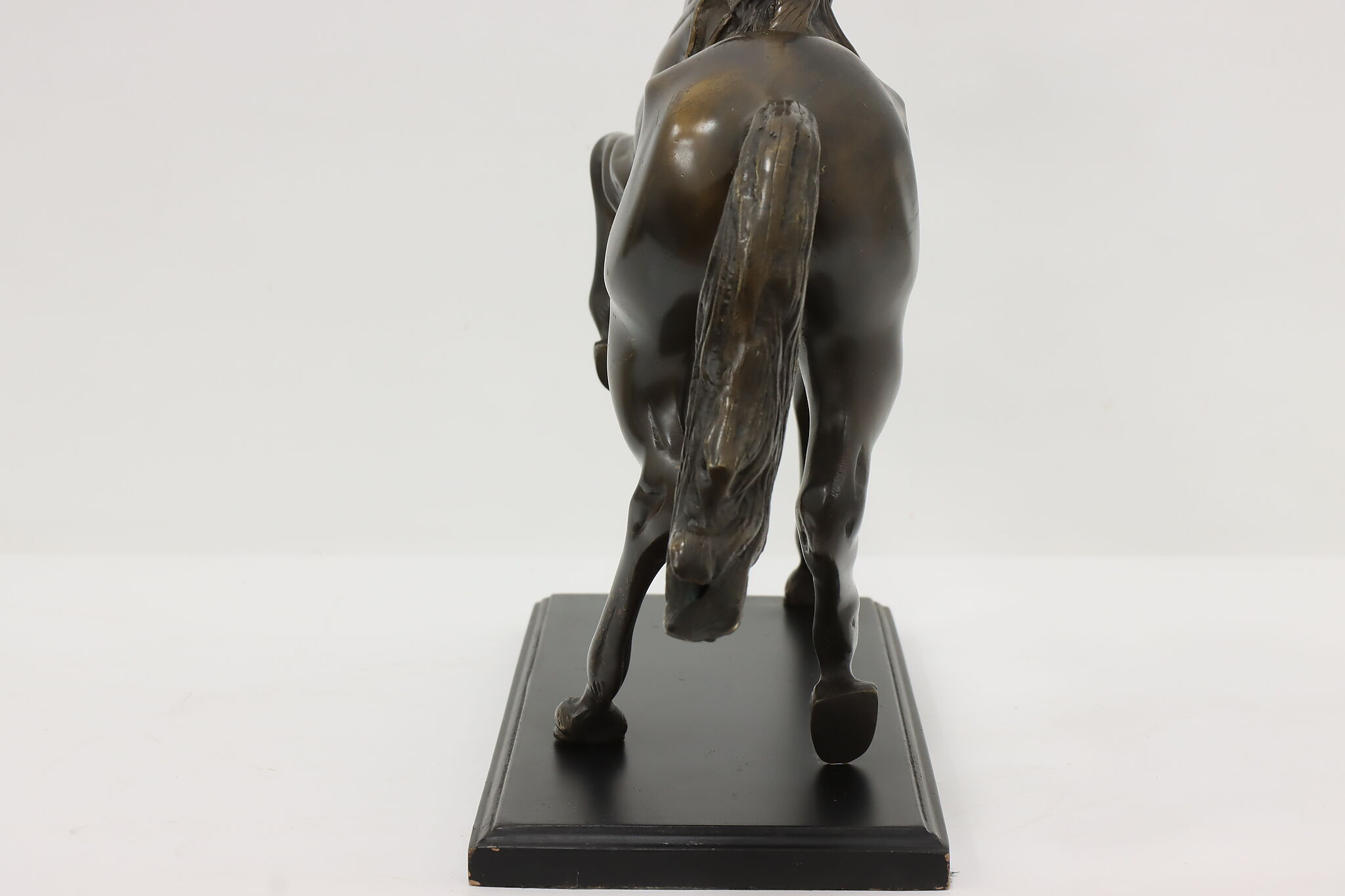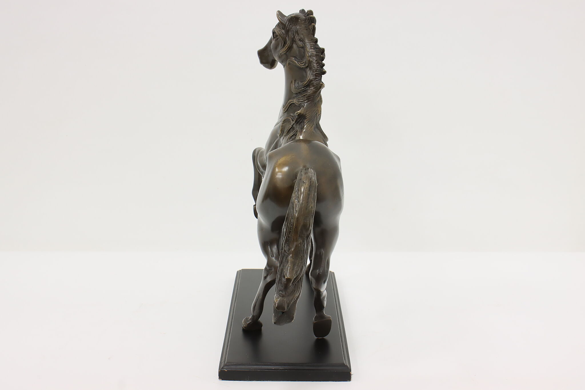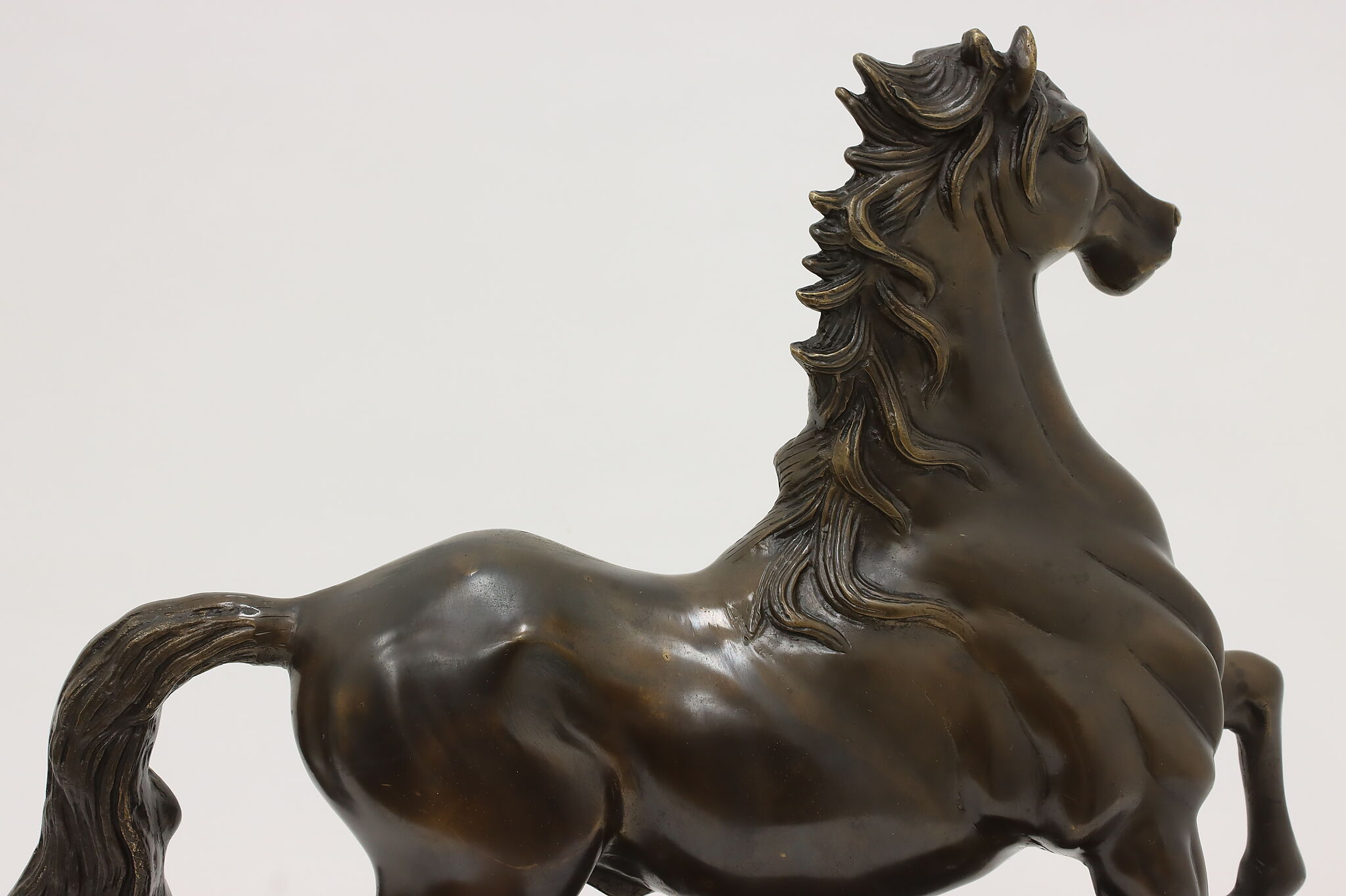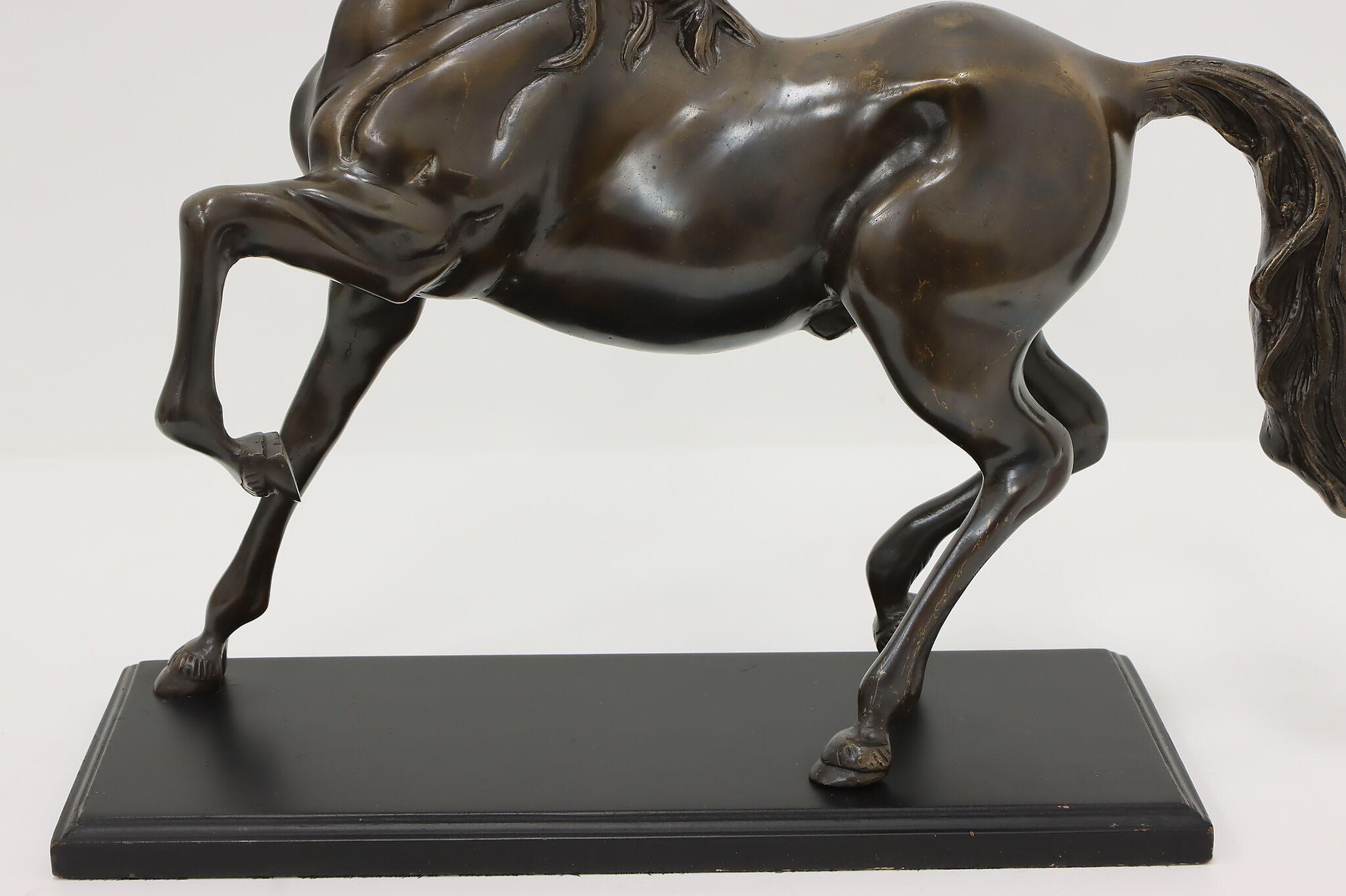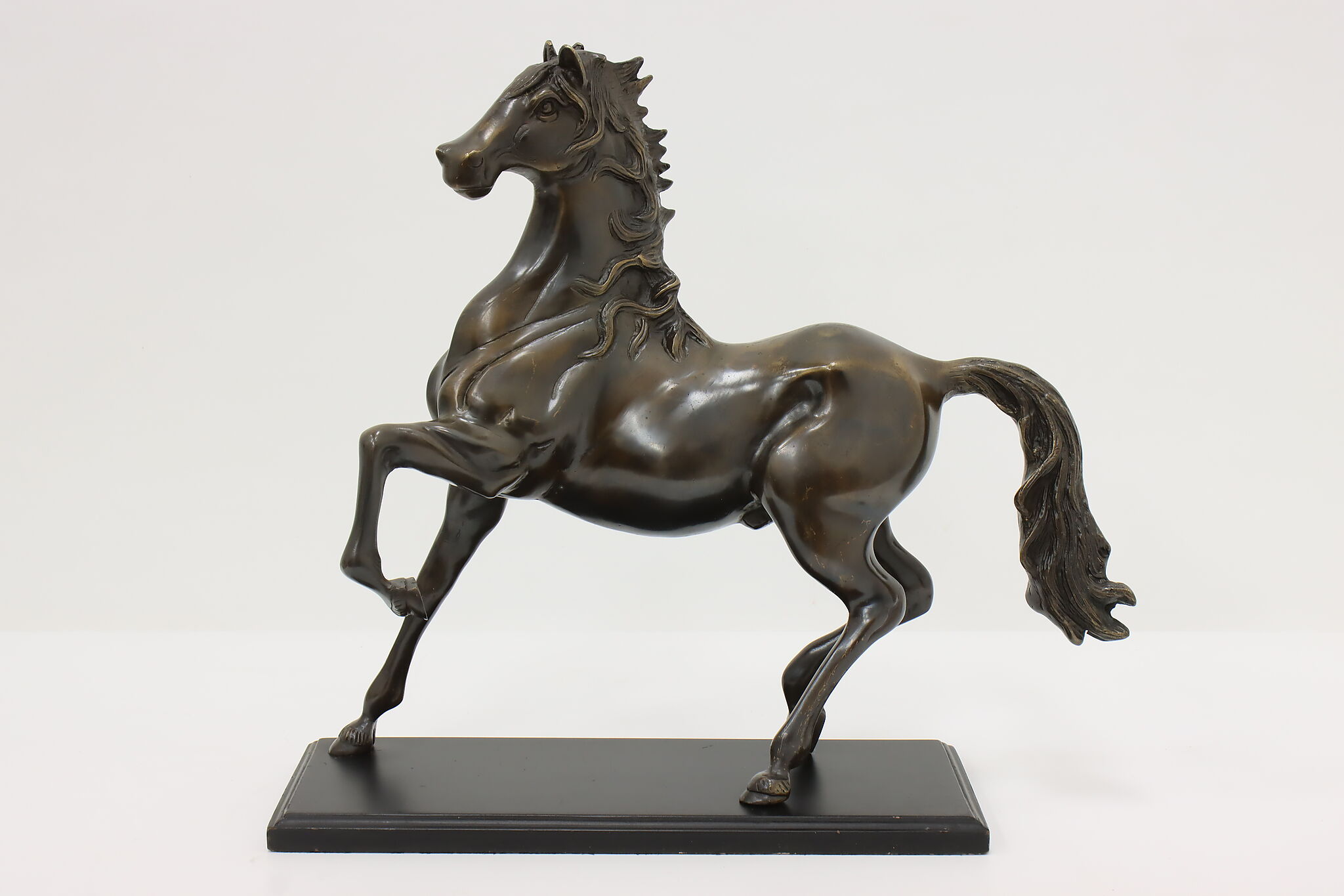 The artist of this sculpture beautifully captures the proud prancing of a wild mustang.