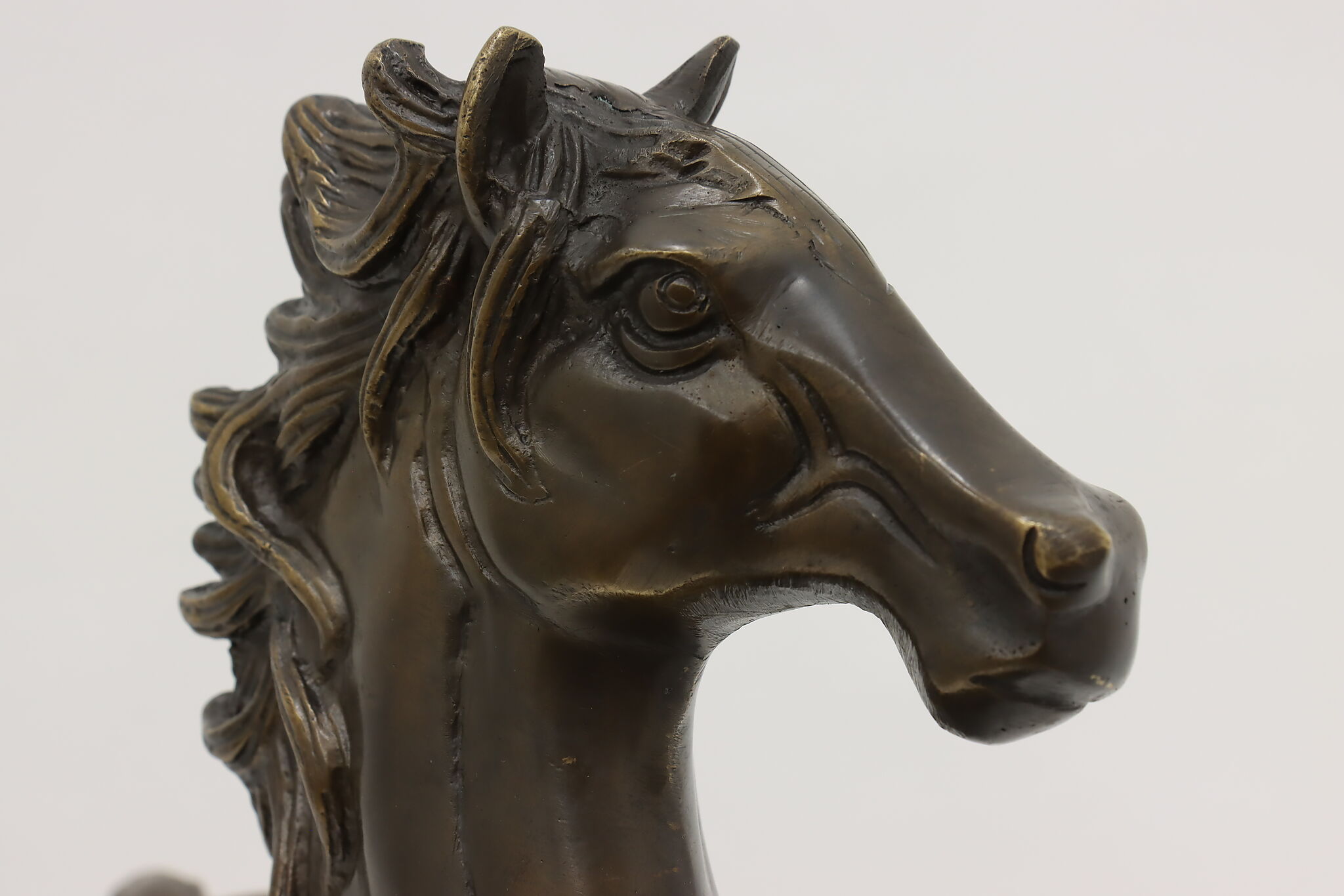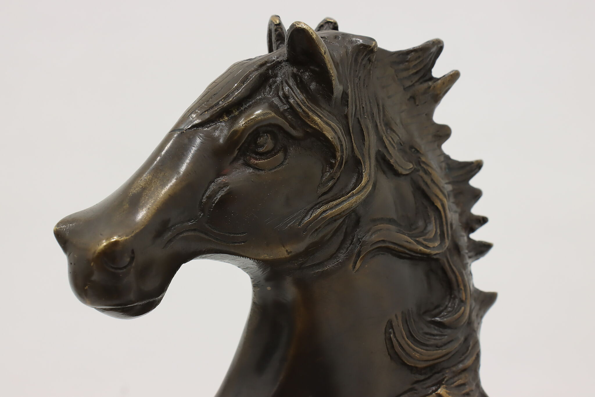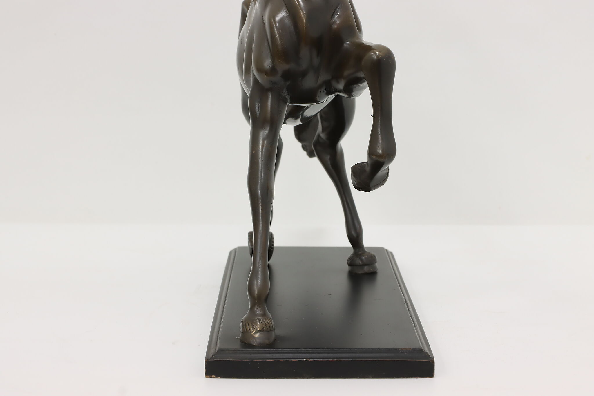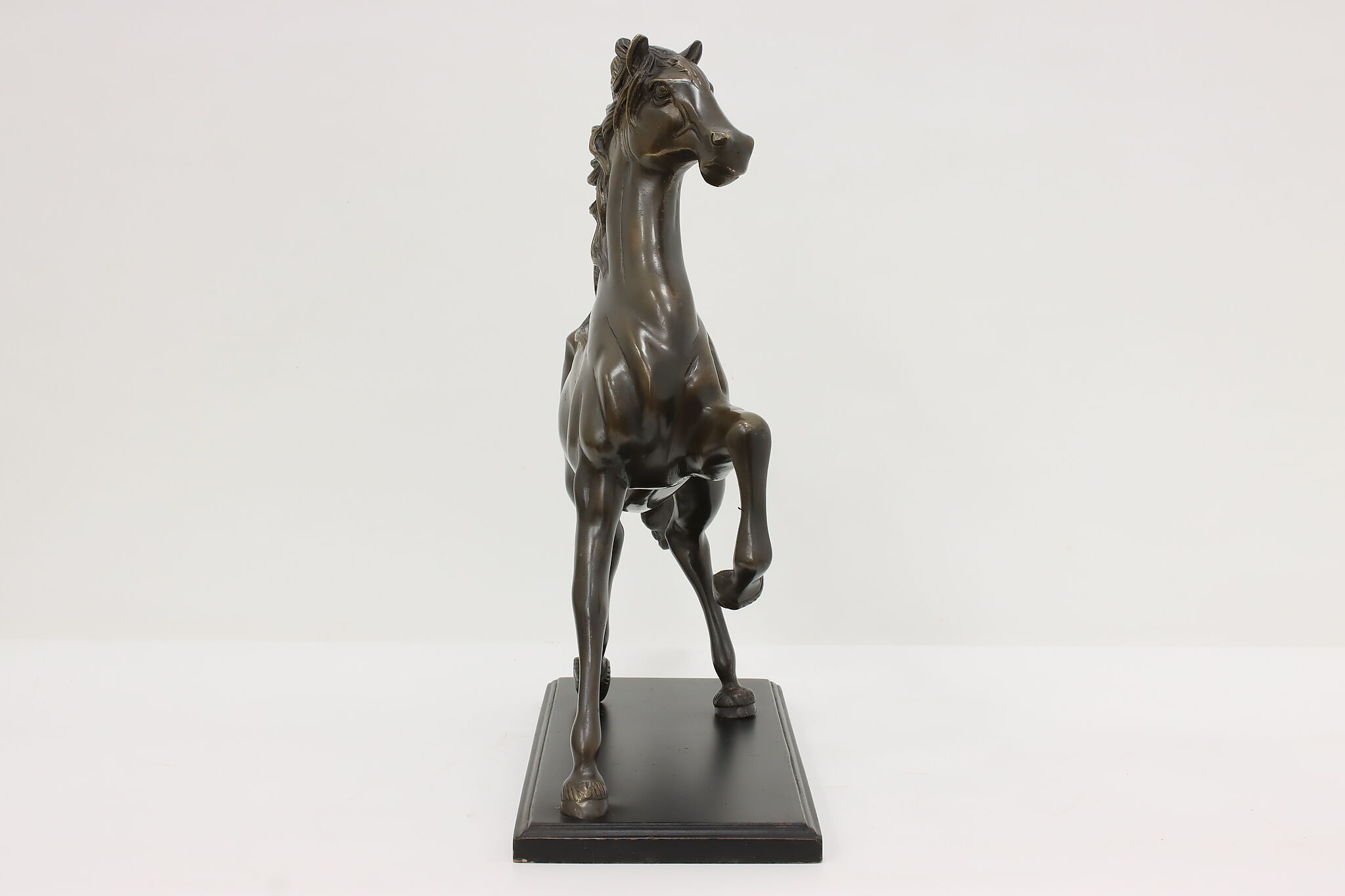 The artist of this sculpture beautifully captures the proud prancing of a wild mustang.