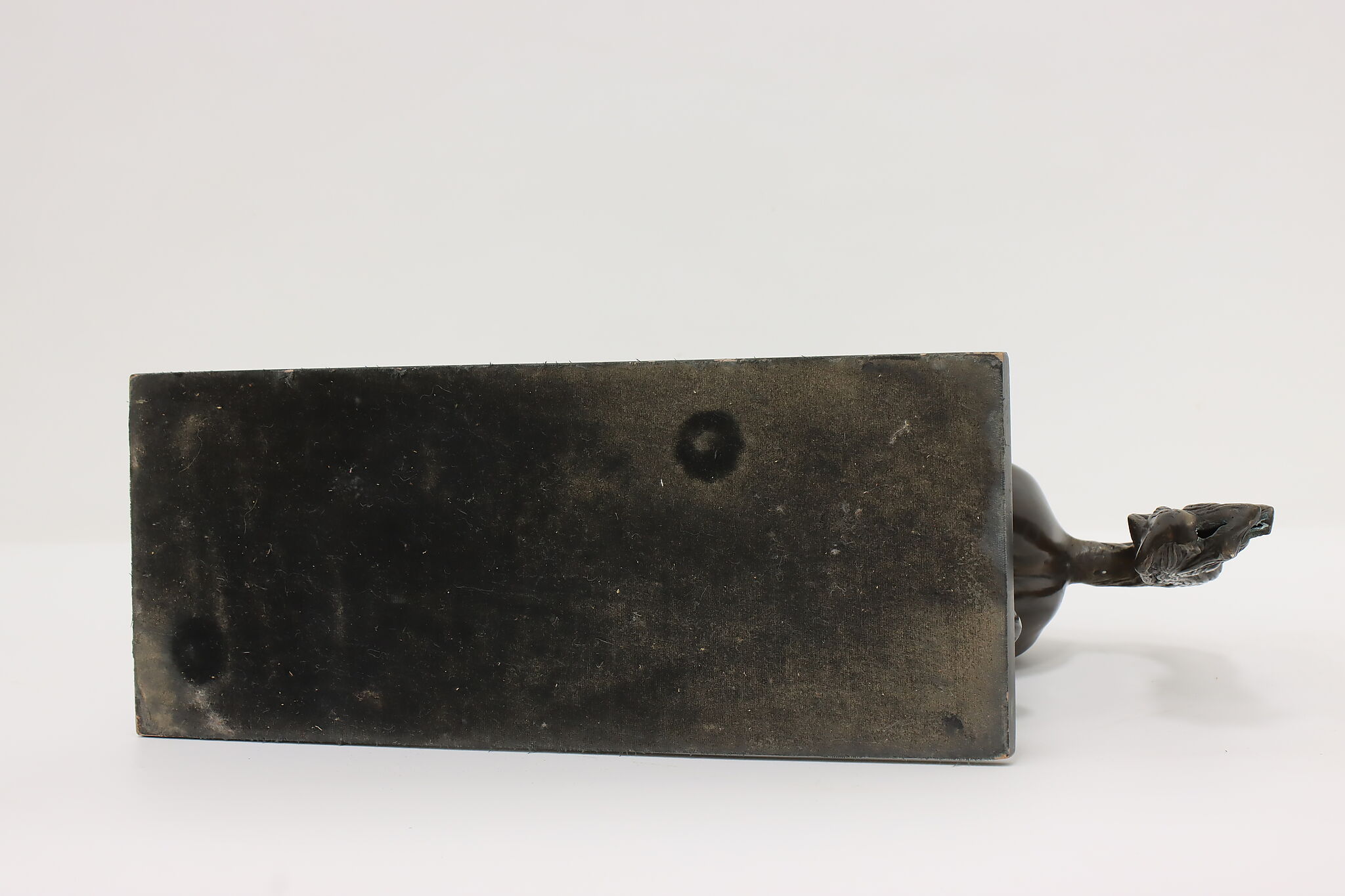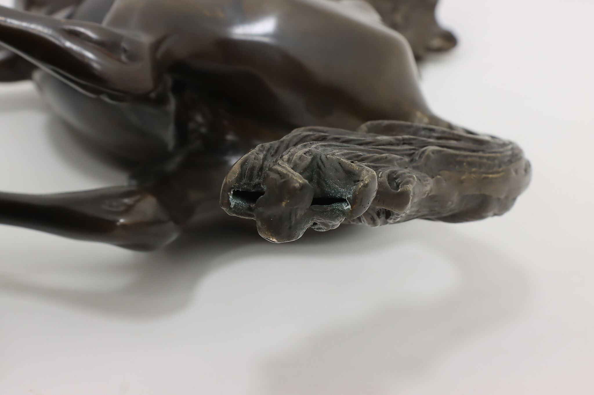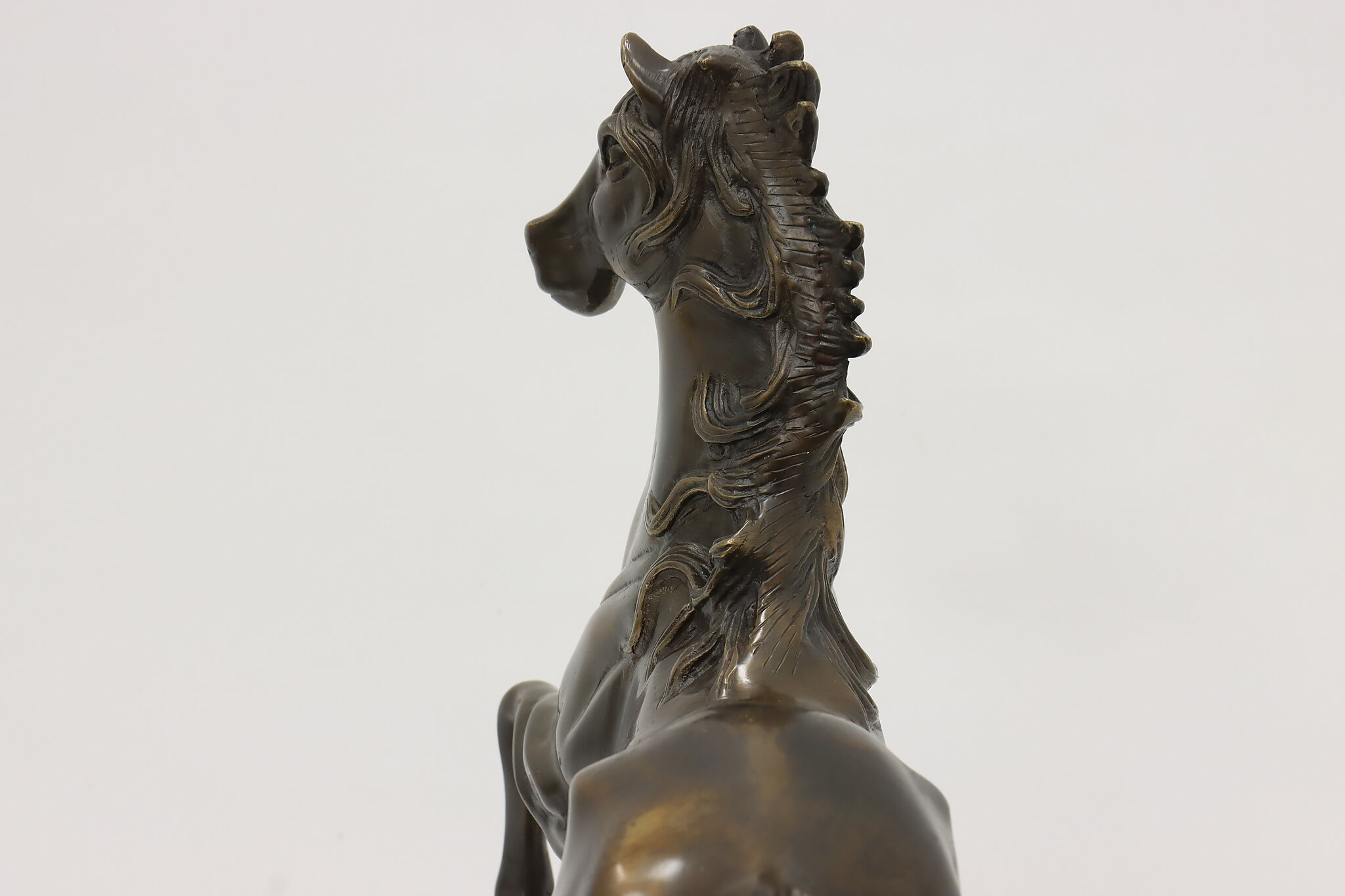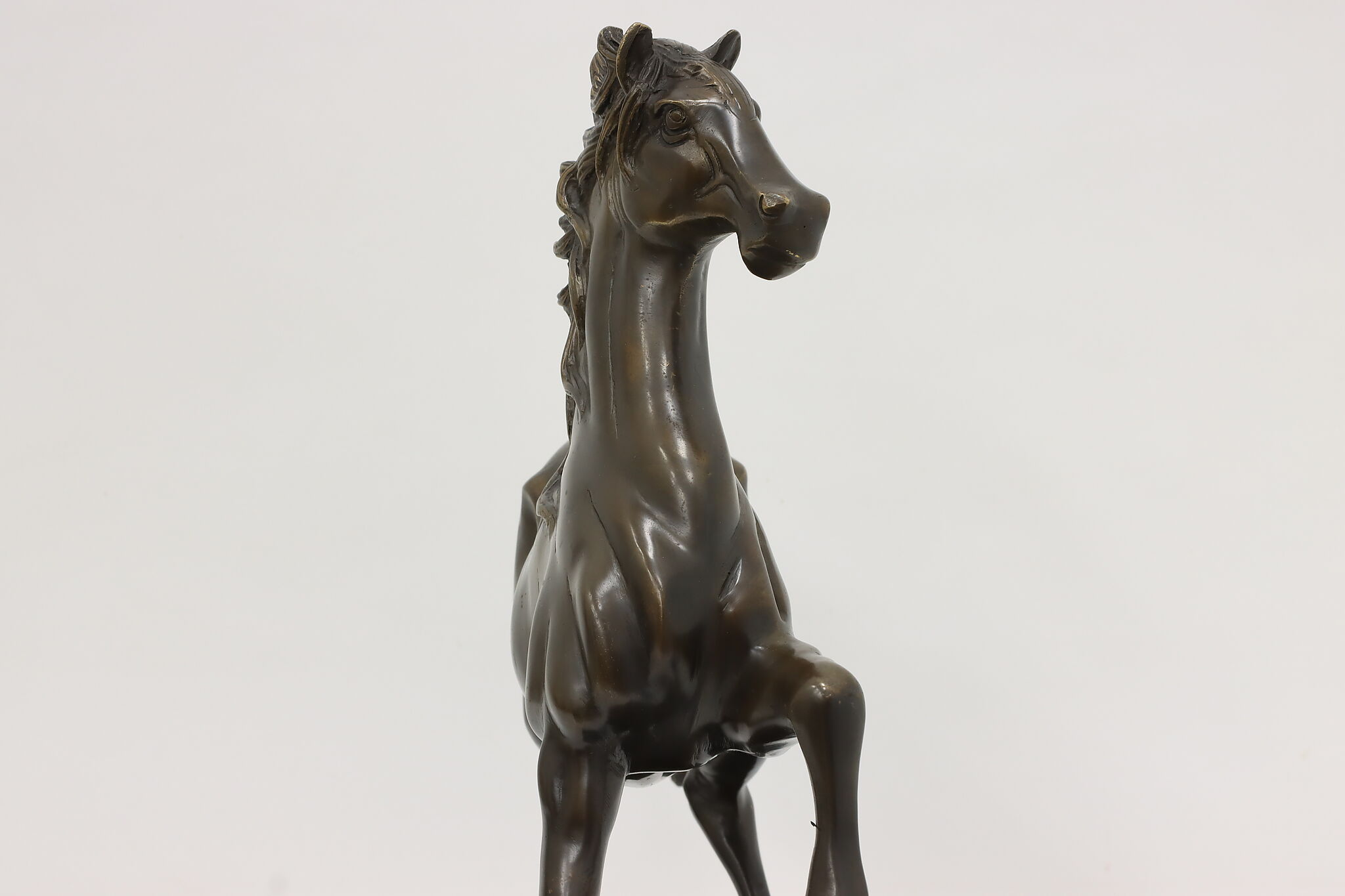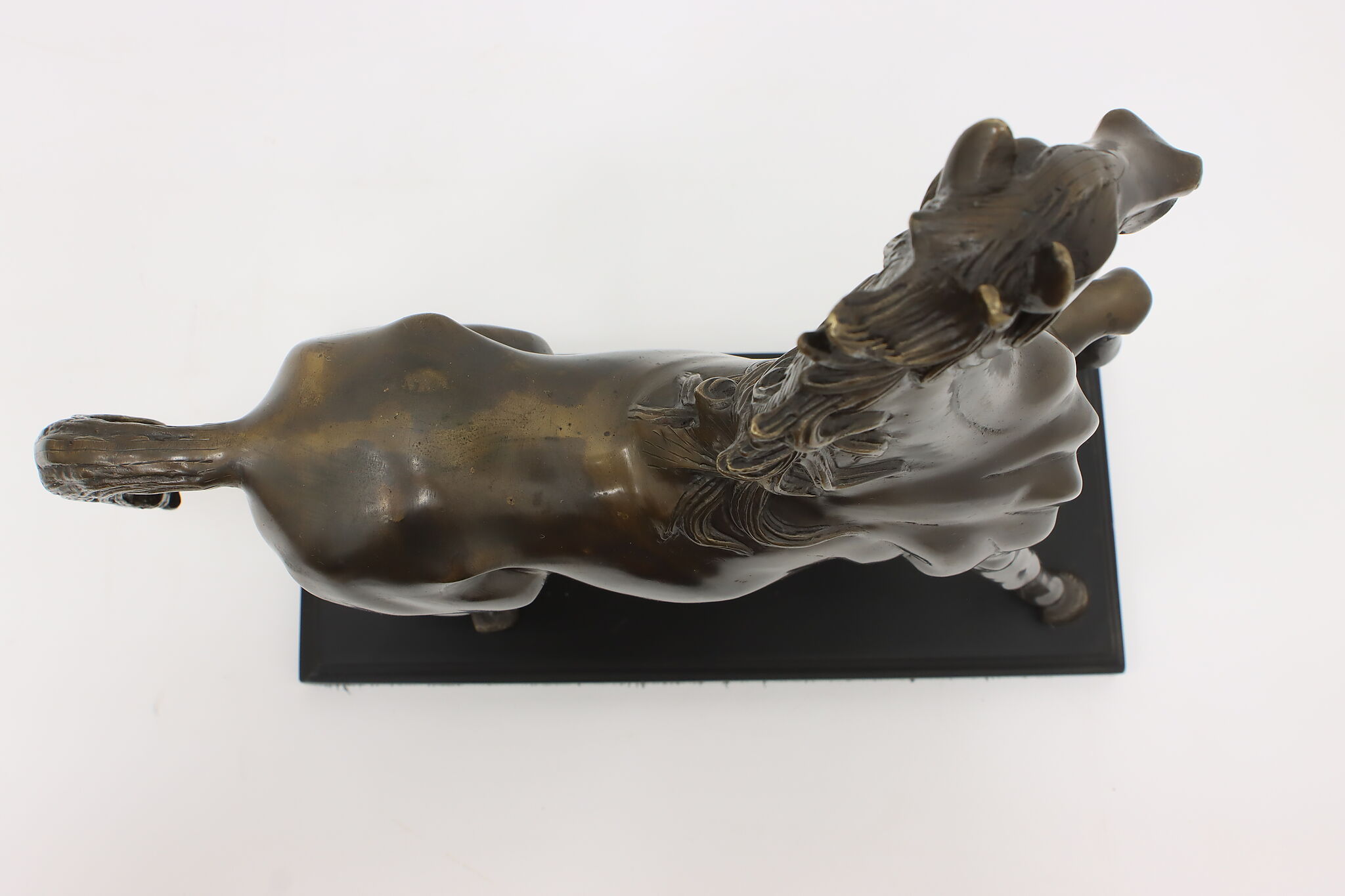 The artist of this sculpture beautifully captures the proud prancing of a wild mustang.