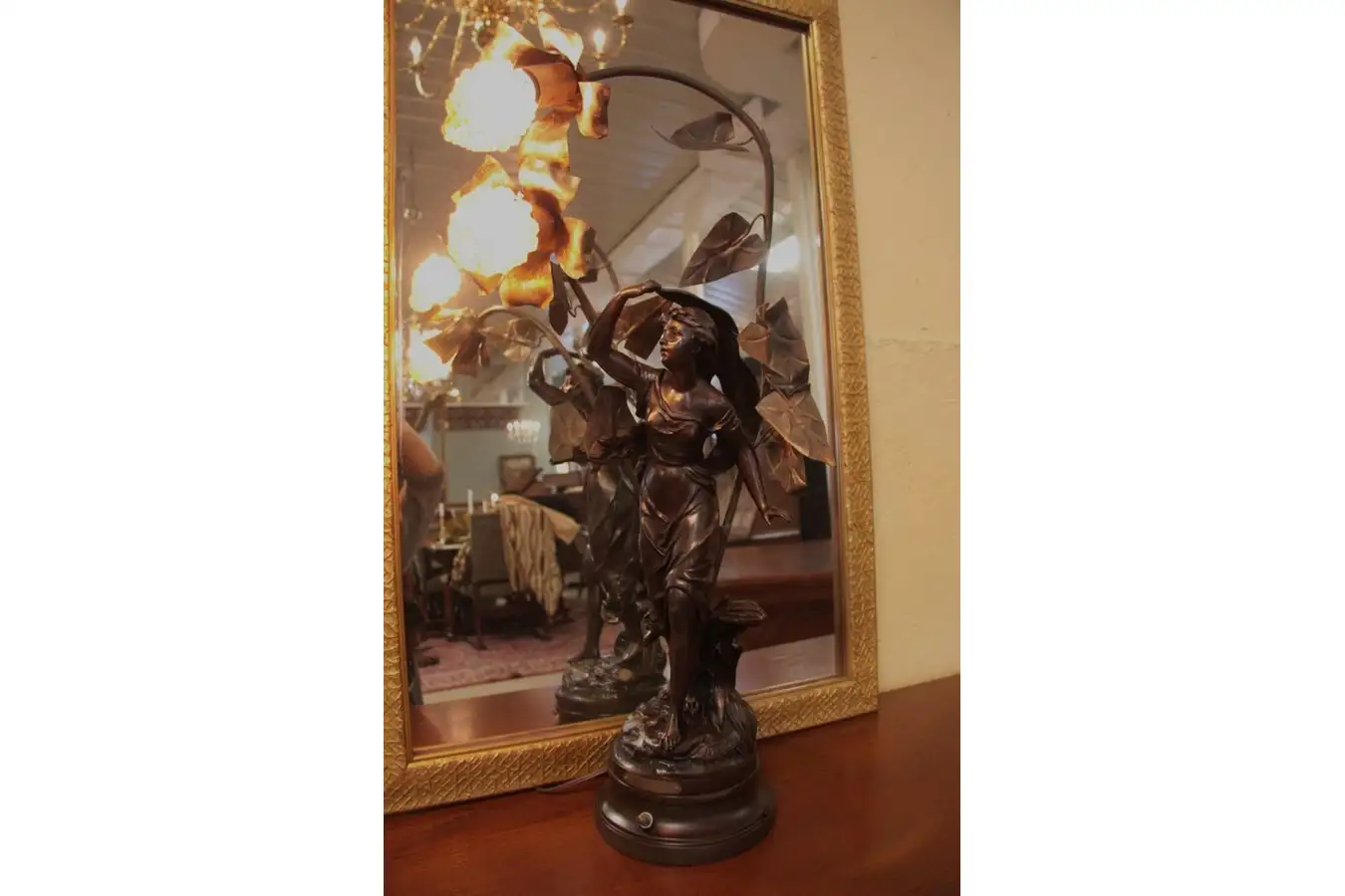 The deep bronze patina is lovely, we see no damage, and height is 26" overall, the statue alone is 17" tall. This exquisite antique from about 1900 can also be used as a table lamp.