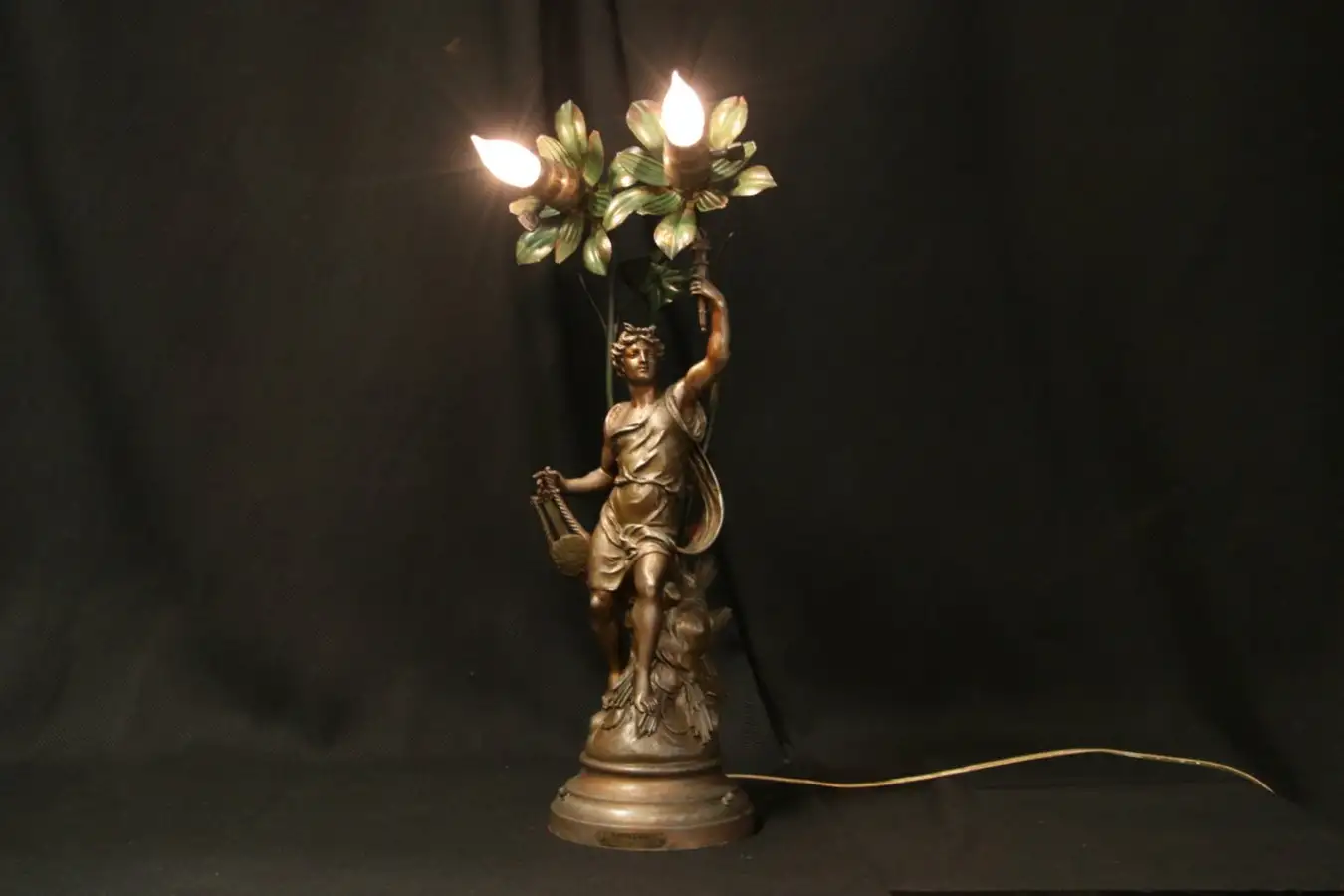 Cast of spelter metal, the alloy is similar to pewter or white metal. The statue has wonderful antique patina - a lovely worn bronze toned finish with hand painted leaves around the brass light sockets.