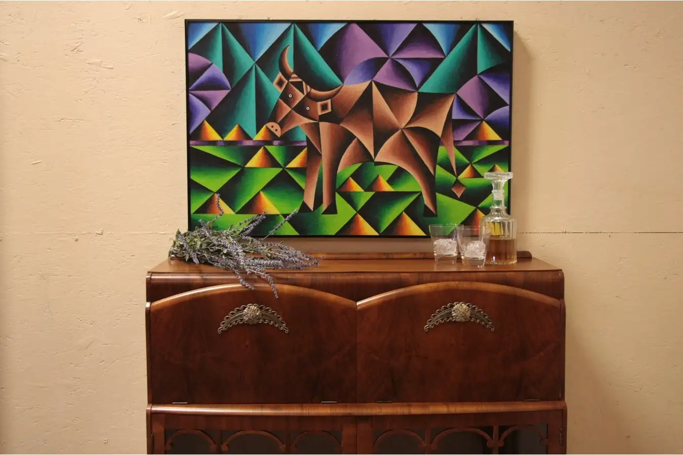 "Bull 3" by Bruce Bodden, pronounced "Bull Cubed" is an acrylic original on canvas, measures 36" by 24".