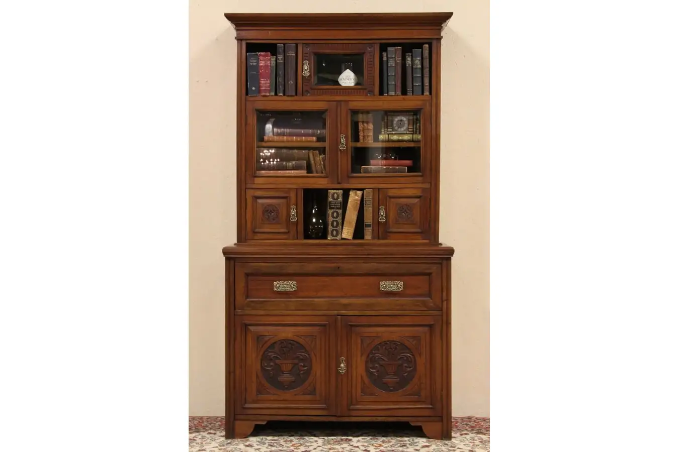 An 1895 era secretary desk with a bookcase top was often called a "Butler's" desk, used by the head of a household staff for book keeping. Solid walnut, hand carved detailing and panels are exquisite. The original finish is very fine, the top of the base is revarnished. This English hand made furniture has warm antique patina and lots of character - mars, shrinkage separations on the sides and a warp to the drop front - see photos. Brass hardware is original.