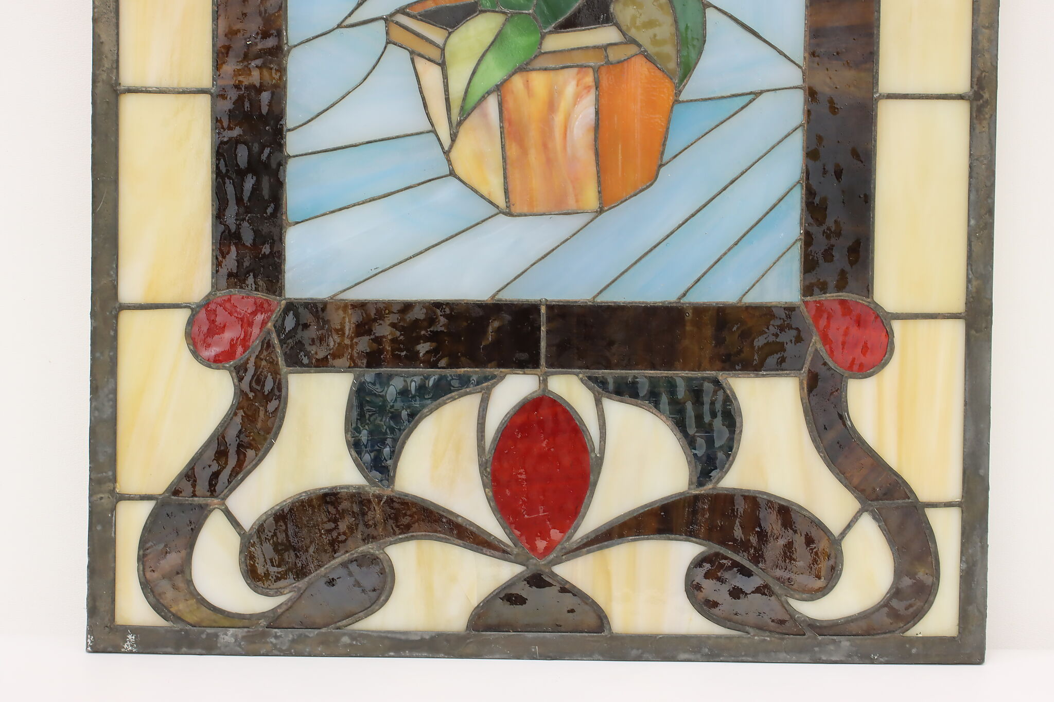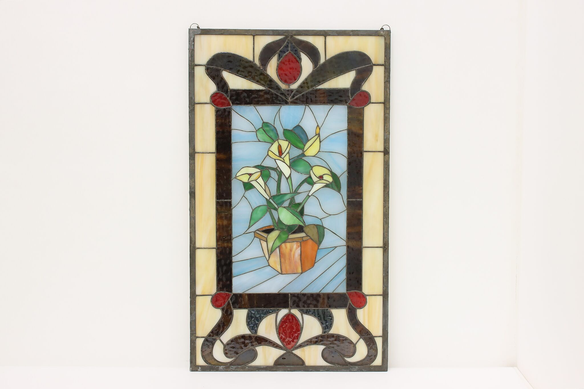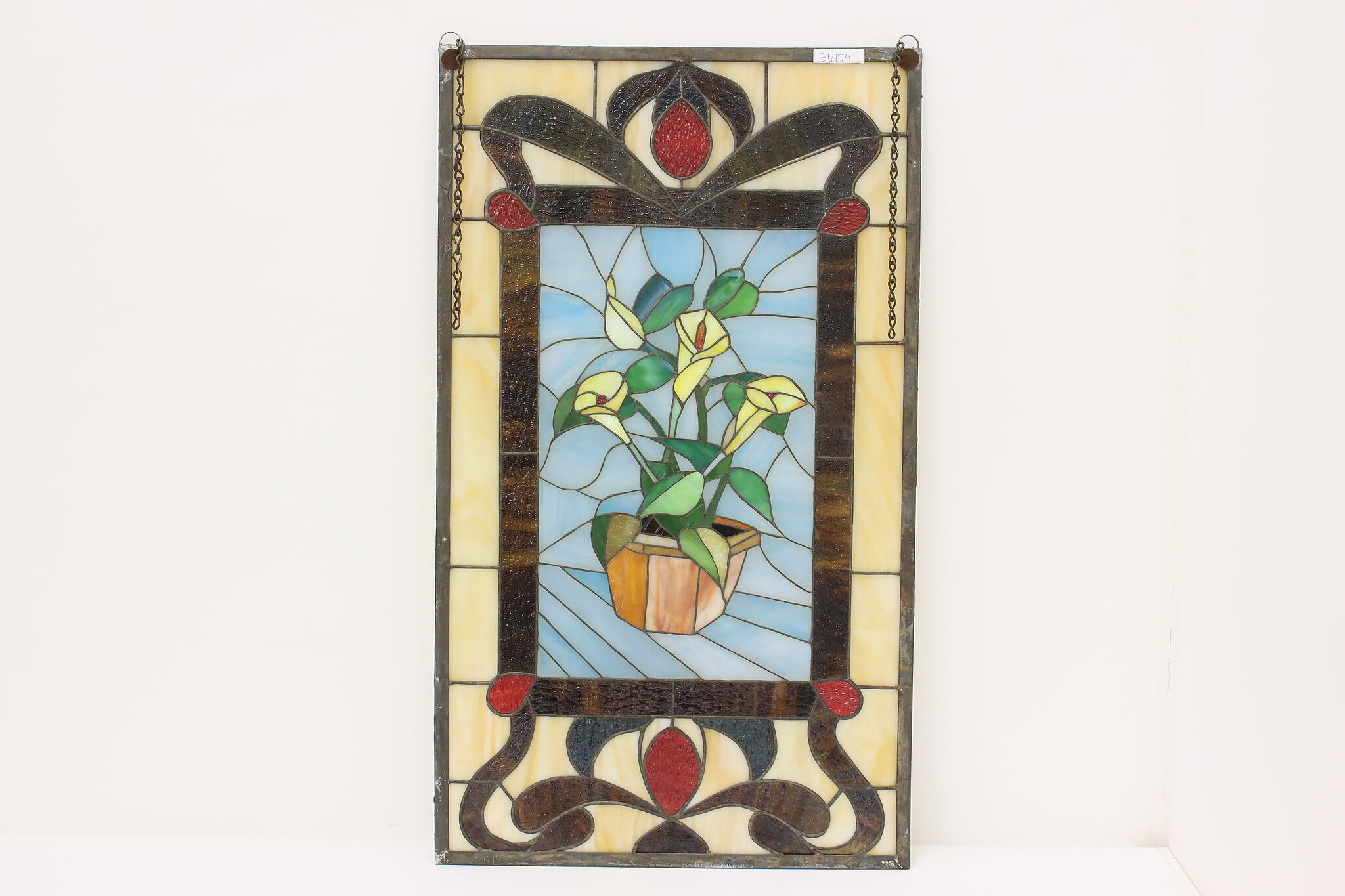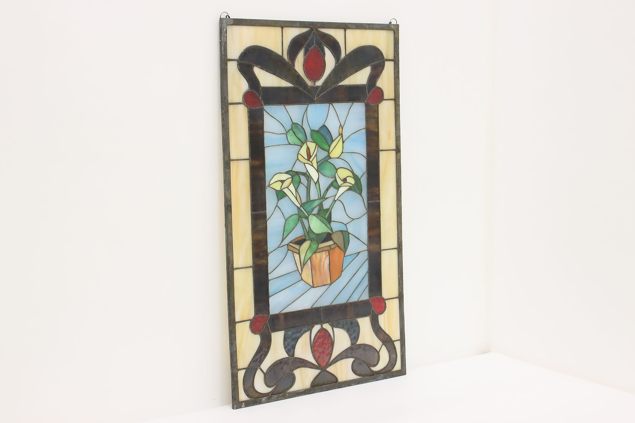 This beautiful stained glass window has a bouquet of calla lilies and would be wonderful hanging in a window.