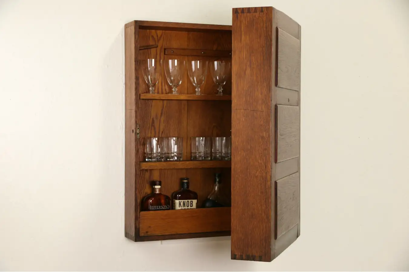 Hand crafted about 1900 by a carpenter to hold his tools, this solid quarter sawn oak wall cabinet could also be a bar chest. The old finish is very well preserved and has been waxed and buffed, so all that is needed to maintain its warm patina is an occasional wipe with a soft dry cloth.