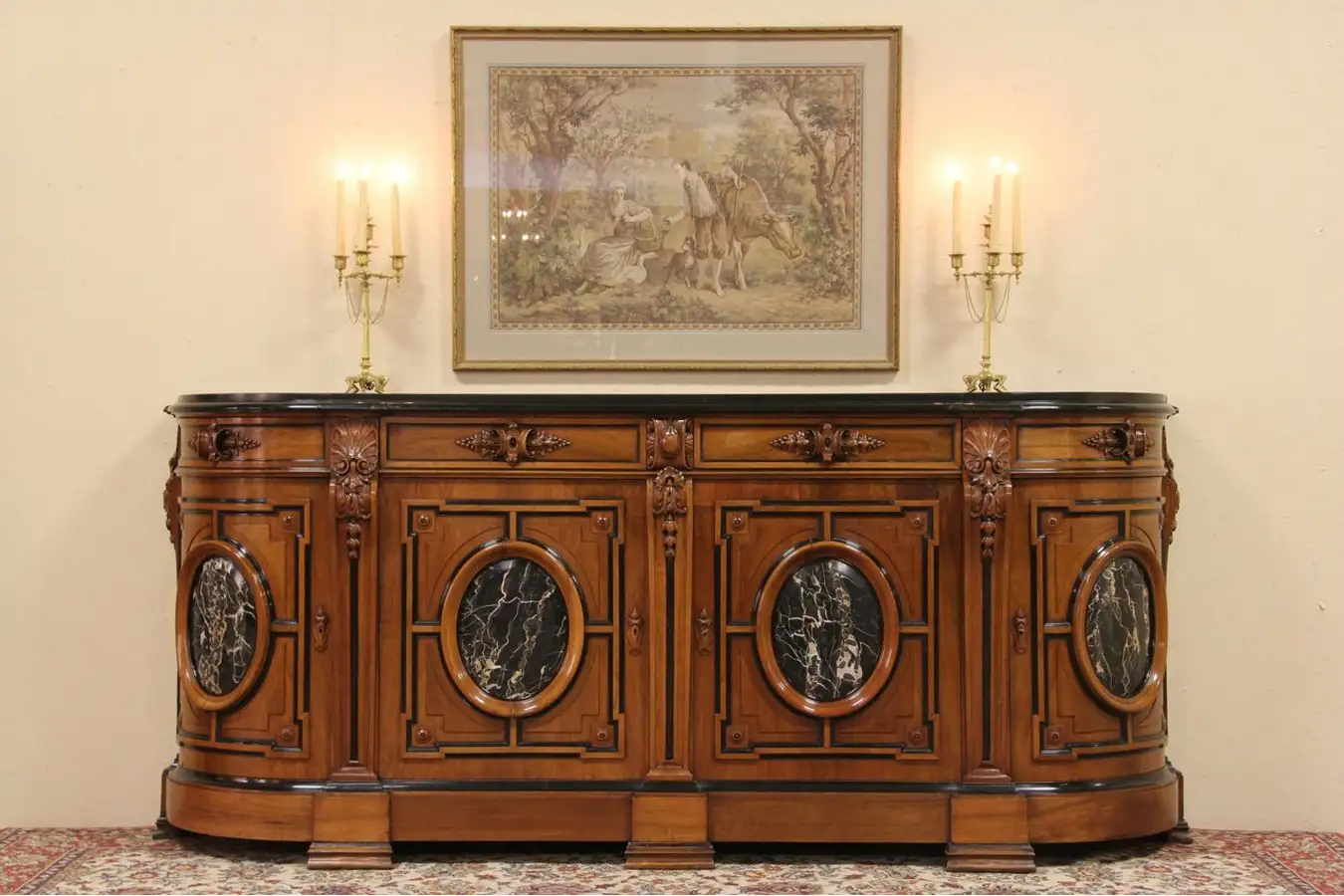 Carved about 1880, this opulent sideboard or server has a black granite top and marble panels on the doors. The finish is in excellent condition with glowing warm antique patina and ebony accents, there are small mars at the edges and a loss to the left center drawer pull, see photos.