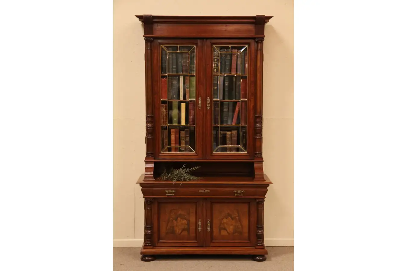 Carved of walnut about 1880, a stately bookcase has leaded beveled glass doors and is in wonderful original condition. The finish is excellent with glowing warm patina, all original with a revarnished top surface.