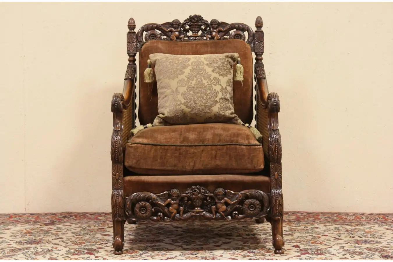 All original from about 1920, this chair has a beautifully hand carved oak frame and three dimensional carved angels or cherubs. Original soft velvet upholstery is faded but has remarkably little wear as shown. The richly detailed solid oak has a very fine finish with expert detailing and barley twist columns.